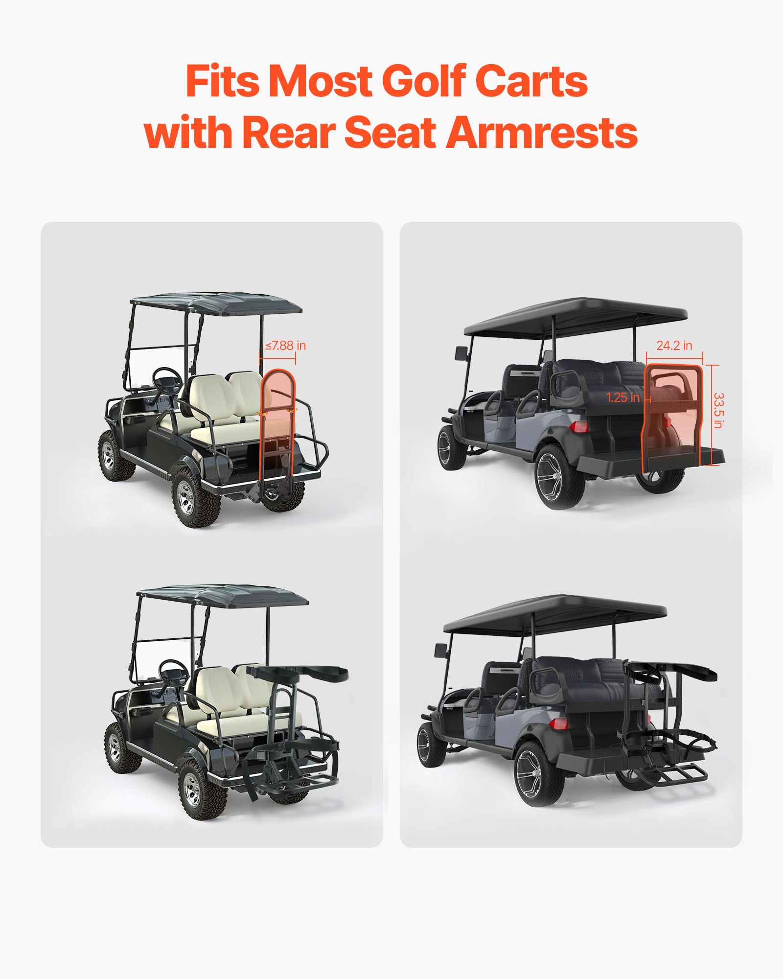 Wide Compatibility: This golf cart bag holder fits most golf carts with rear handrails (handrail width ≤7.88 inches), including EZGO, Club Car, and Yamaha models