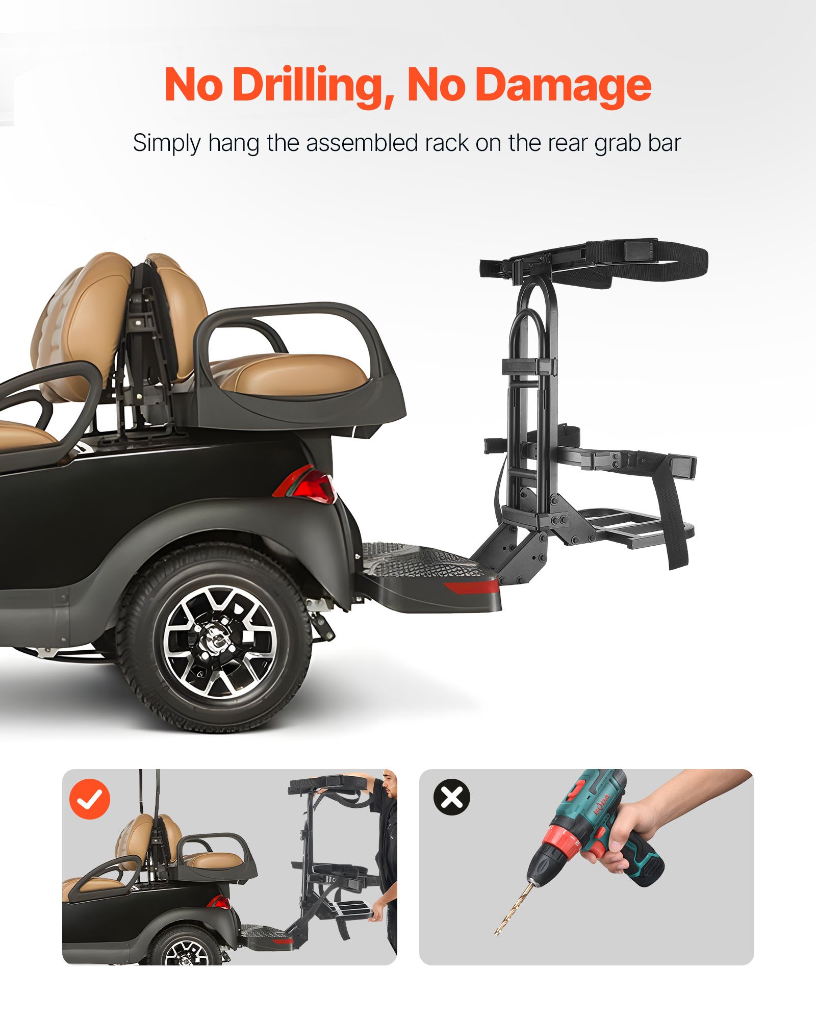 No-Drilling Installation: Our golf bag holder for golf cart installs instantly using straps around rear handrails—zero drilling or modifications required