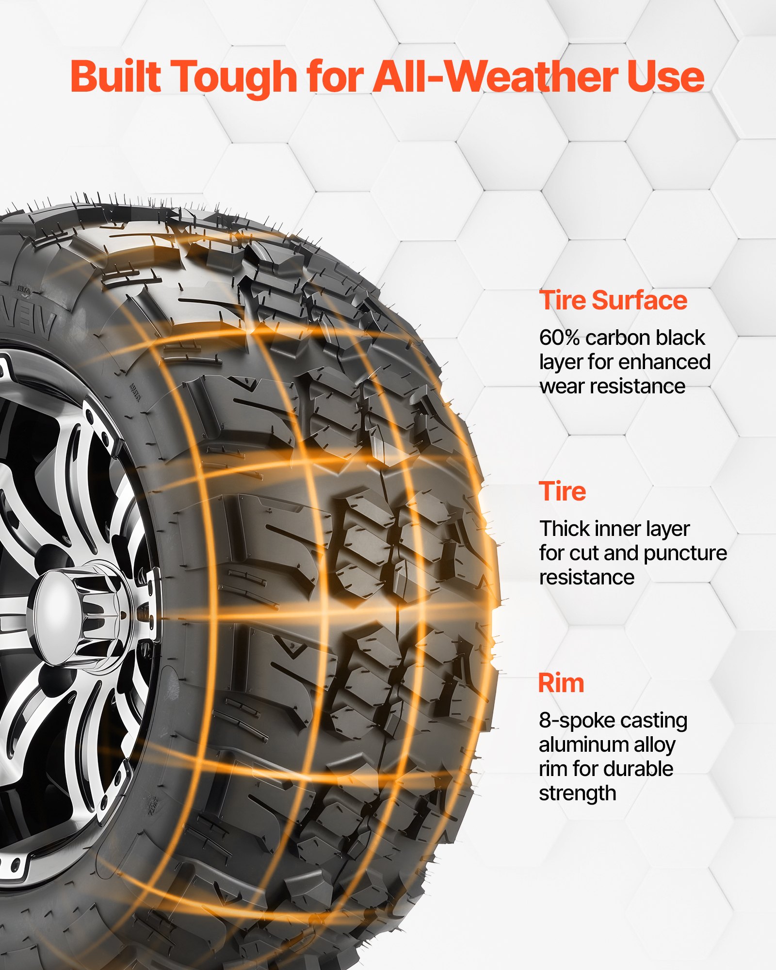 Reliable Traction: Crafted from 4-ply rubber construction, our golf cart wheels and tires withstand punctures and wear, ensuring traction and stability. They provide smooth driving across rough surfaces, gravel, and grass, reducing lawn damage