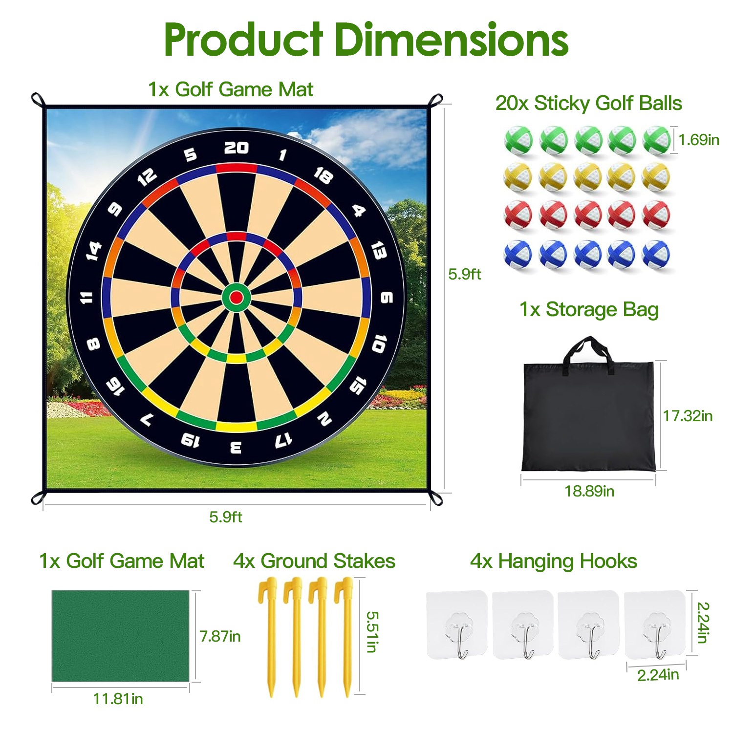 *Complete Golf Game Mat Set*:Our interesting golf game set includes complete accessories:1* golf game mat,1* chipping mat,1* storage bag,20* sticky golf balls in different colors,4* ground stakes and 4* hanging hooks,allows up to 4 players to enjoy hours of fun. Are you prepared to start a challengeable golf game with your friends and family?