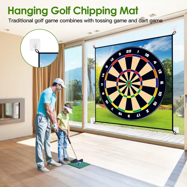 *Complete Golf Game Mat Set*:Our interesting golf game set includes complete accessories:1* golf game mat,1* chipping mat,1* storage bag,20* sticky golf balls in different colors,4* ground stakes and 4* hanging hooks,allows up to 4 players to enjoy hours of fun. Are you prepared to start a challengeable golf game with your friends and family? *Toss Game & Golf Game*:4 Ground stakes can tightly secure the hitting game mat on the beach or backyard grass,serving as a traditional golf play and practice mat. Additionally,we provide 4 hanging hooks to help mount the golf mat on the wall,so as you can play a tossing game or dart game(Not Include Dart) with it in party and family gathering. *Perfect For Parent-Child Interaction*:Our golf game set is an affordable and educational toy for your kids to get to know golf and practice their golfing skills,helping them to enhance muscles,joints and ligaments development. Most importantly,it’s a great way to promote the parent-child interaction and close the relationship with your kids. *Washable & Durable Material*:Made of durable thickened plush fiber with reinforced edges,provide more stable sticking abilities and better experiences. Washable material is easy to clean,not easy to fade,deform,ensure you long lasting service life. *Perfect Gift*:This golf chipping game mat set can be quickly set up within 3 minutes,perfect gift for kids and adults,beginners and pros. Come with convenient storage bag,easily carry to anywhere,like office,backyard,park,lawn,beach,campground,etc.. Enjoy the relaxing playing time with your friends and family!