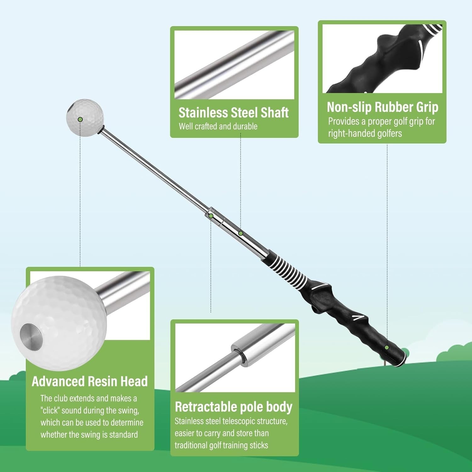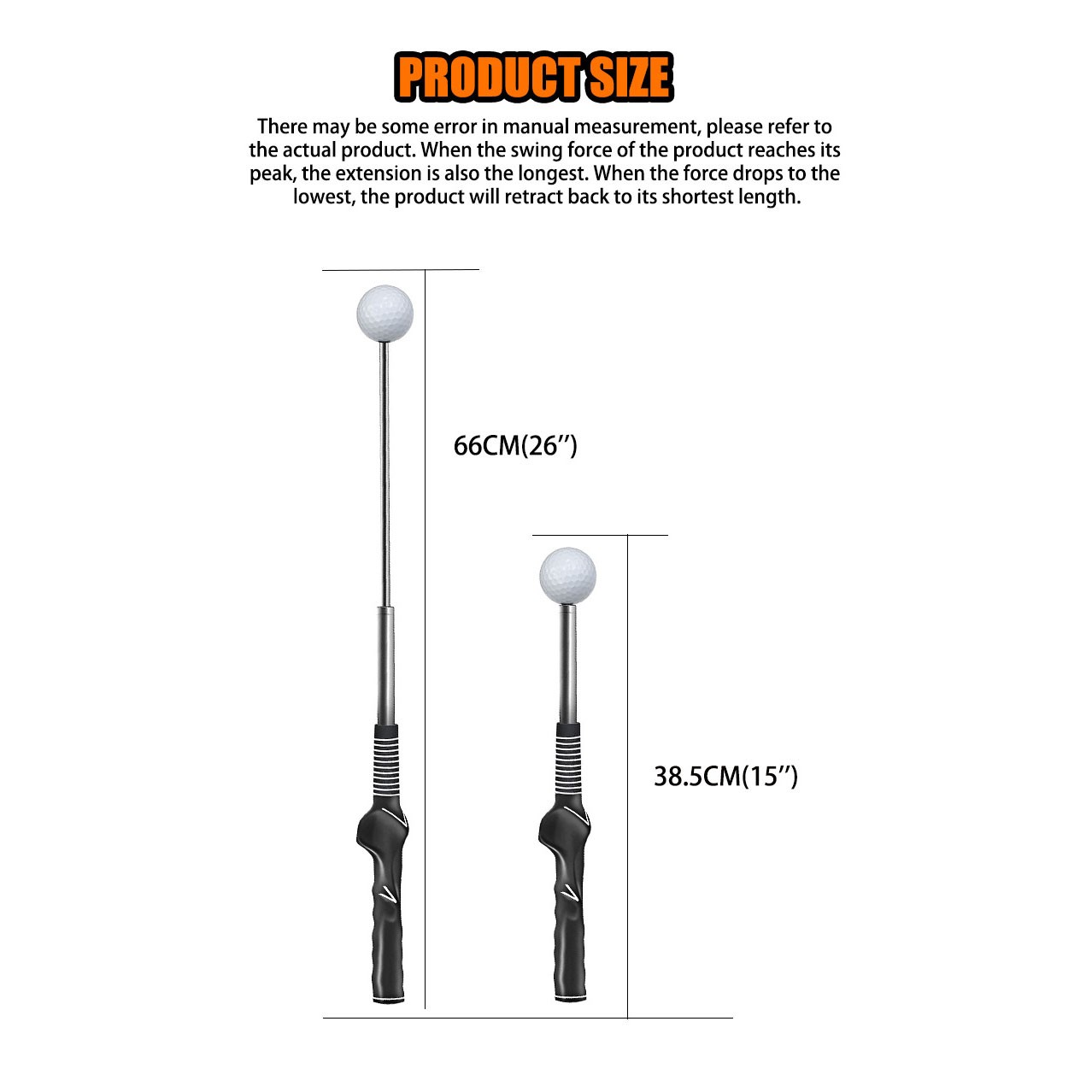 【Retractable Golf Trainer】: It can be retracted to 15 inches, making it convenient to store in golf bags or luggage, and then extended to a match length of 26 inches. Its space-saving yet balanced structure makes it an ideal choice for travel warm-up, pre-race practice or quick training anywhere.