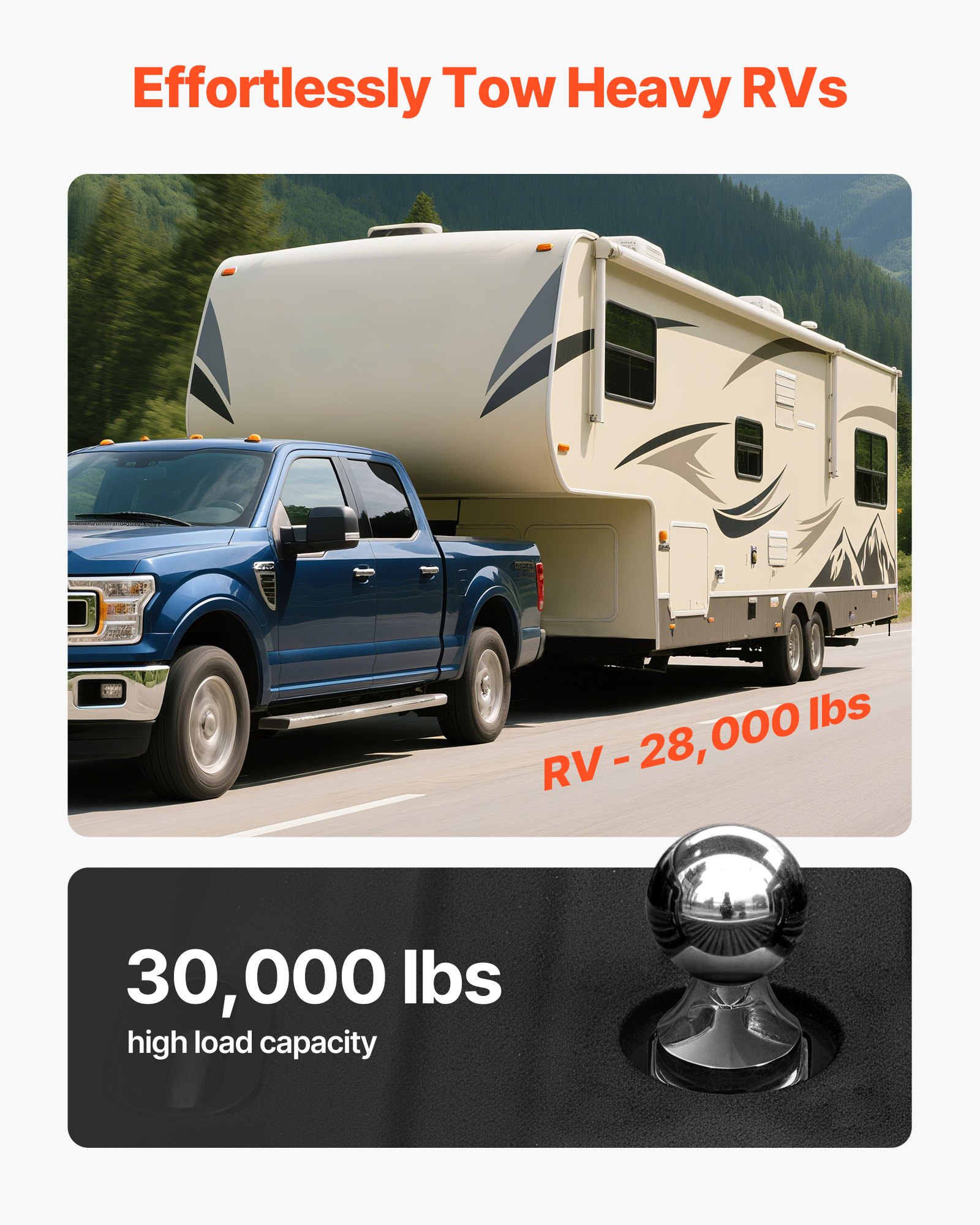 30,000 lbs Load Capacity: Features excellent 30000 lbs load capacity, the gooseneck ball hitch has 50% more traction than traditional 20000 lbs ball heads. It handles complex towing scenarios with trees and obstacles to ensure towing operations