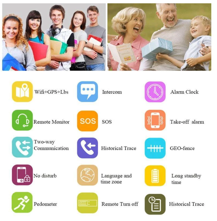 【Basic functions】: SOS one-key call, family phone dialing, two-way call, voice monitoring precise positioning, wrist off alarm, security fence, history track, low power alarm, remote shutdown, remote upgrade