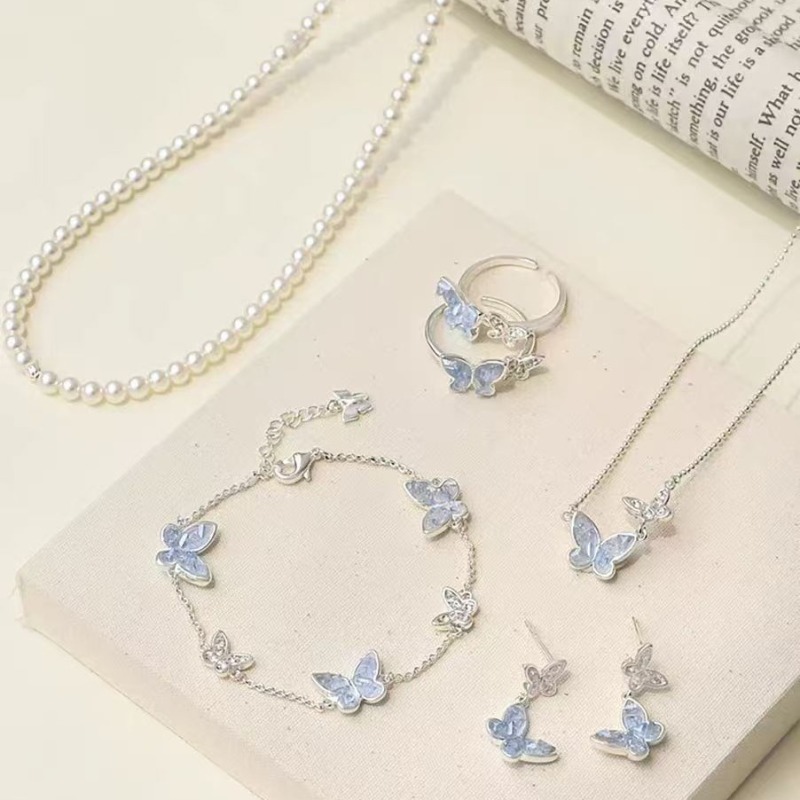 Color: blue crystal size butterfly necklace, blue crystal size butterfly bracelet, blue crystal size butterfly stud, blue crystal size butterfly necklace pearl necklace