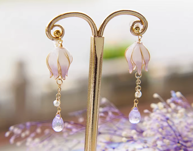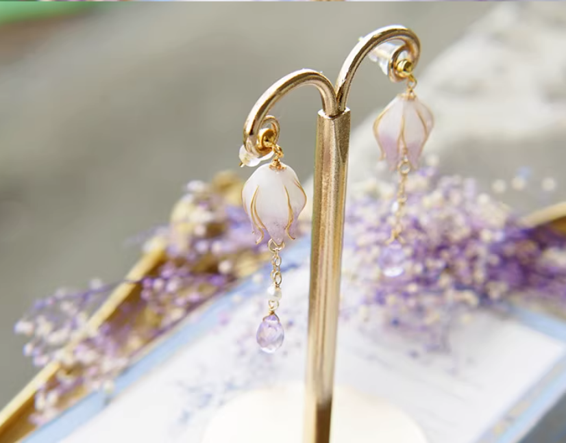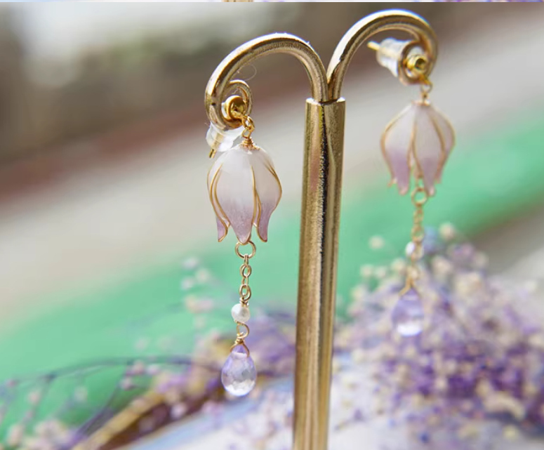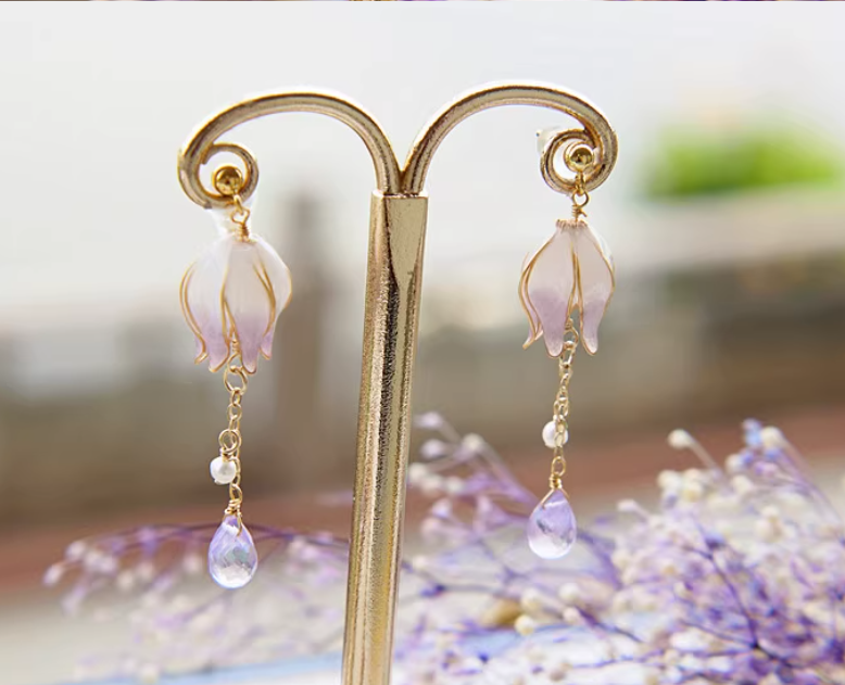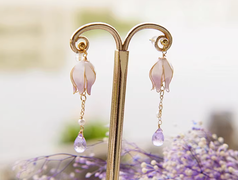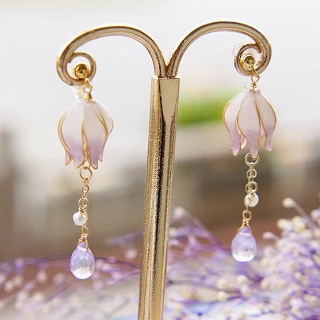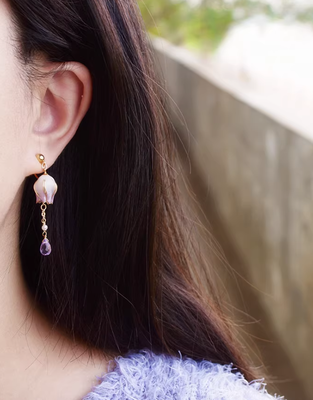 Gradient Color Flower Core Amethyst Water Drop Tassel Ear Studs
