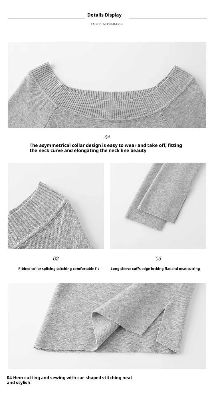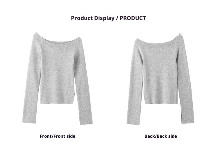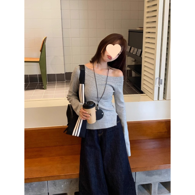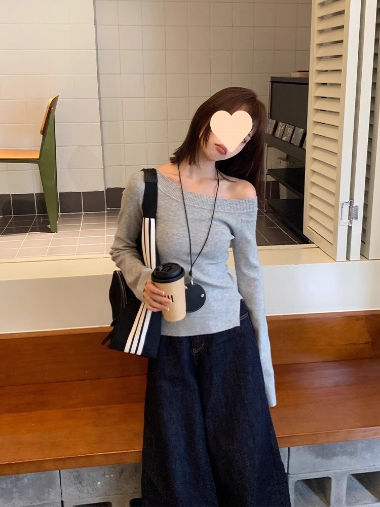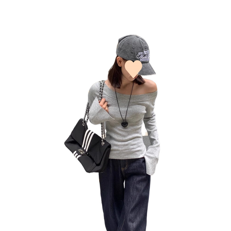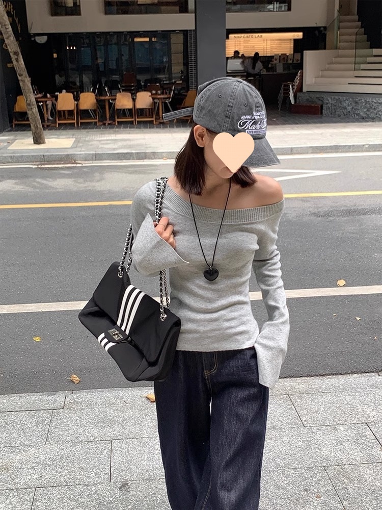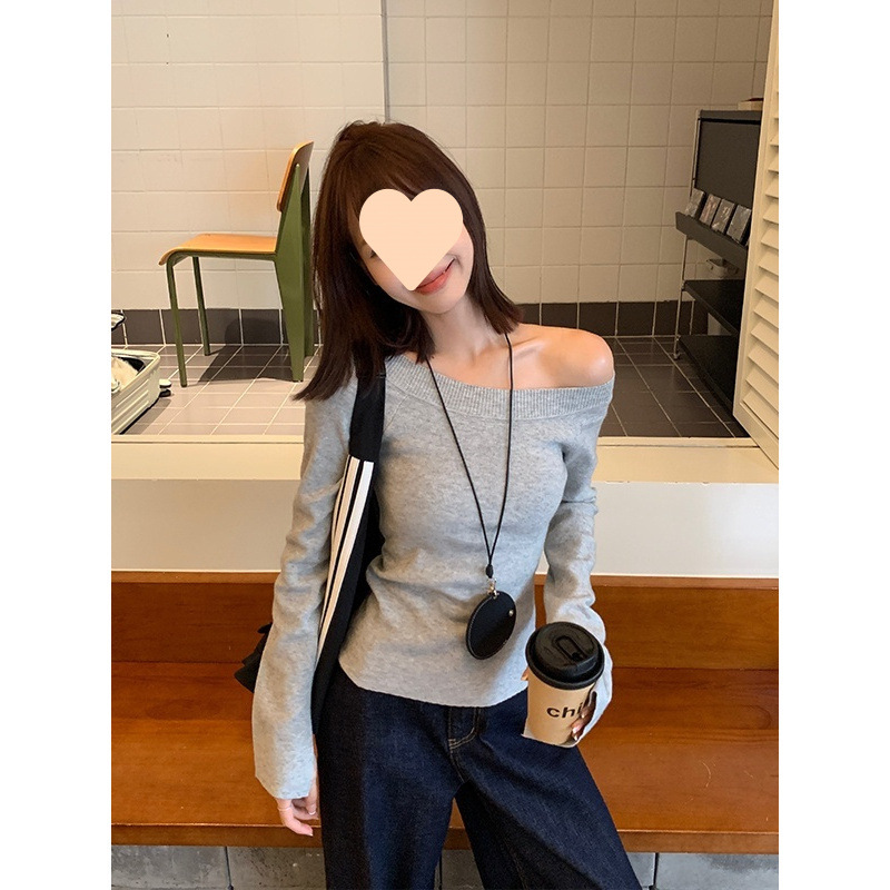 Gray Strapless Sloping Shoulder Long-sleeve T-shirt Women