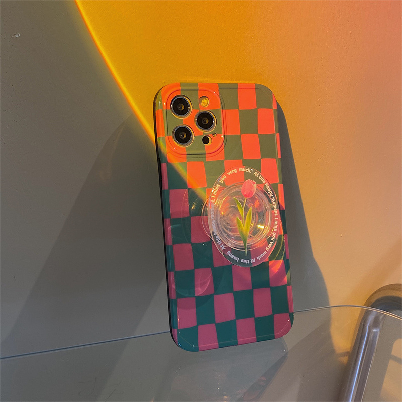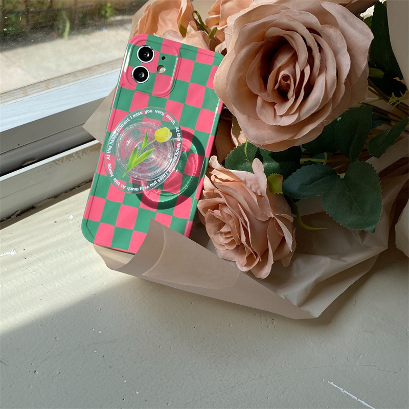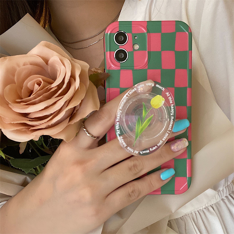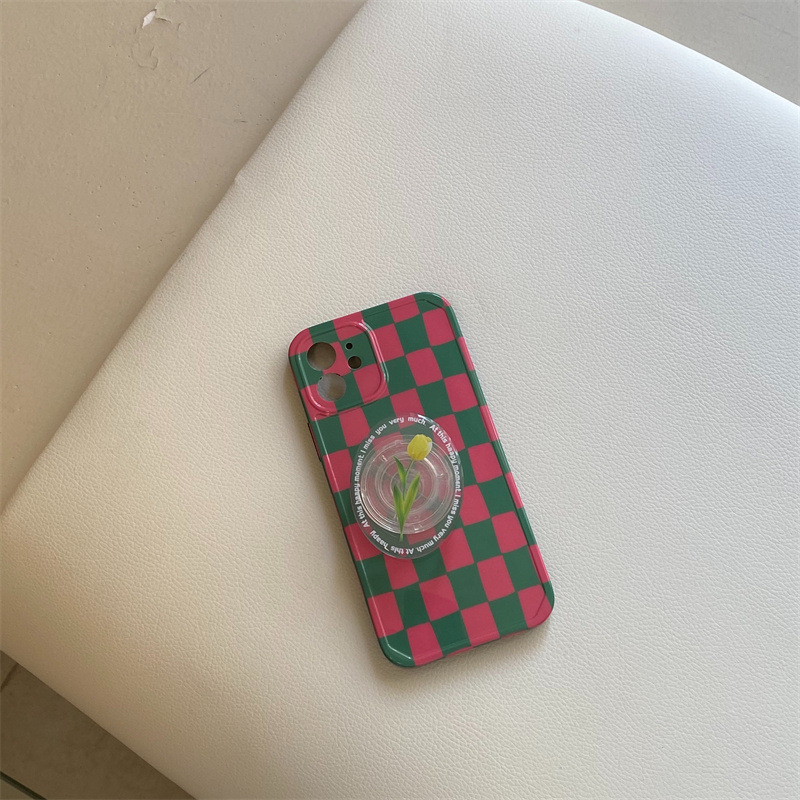 Color: photo frame-pink and green grid pattern + pink tulip stand, photo frame-pink and green grid pattern + yellow tulip stand