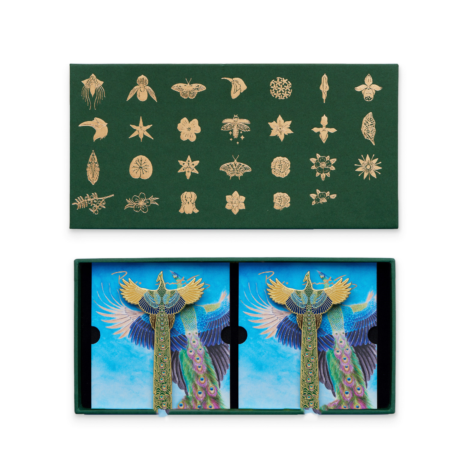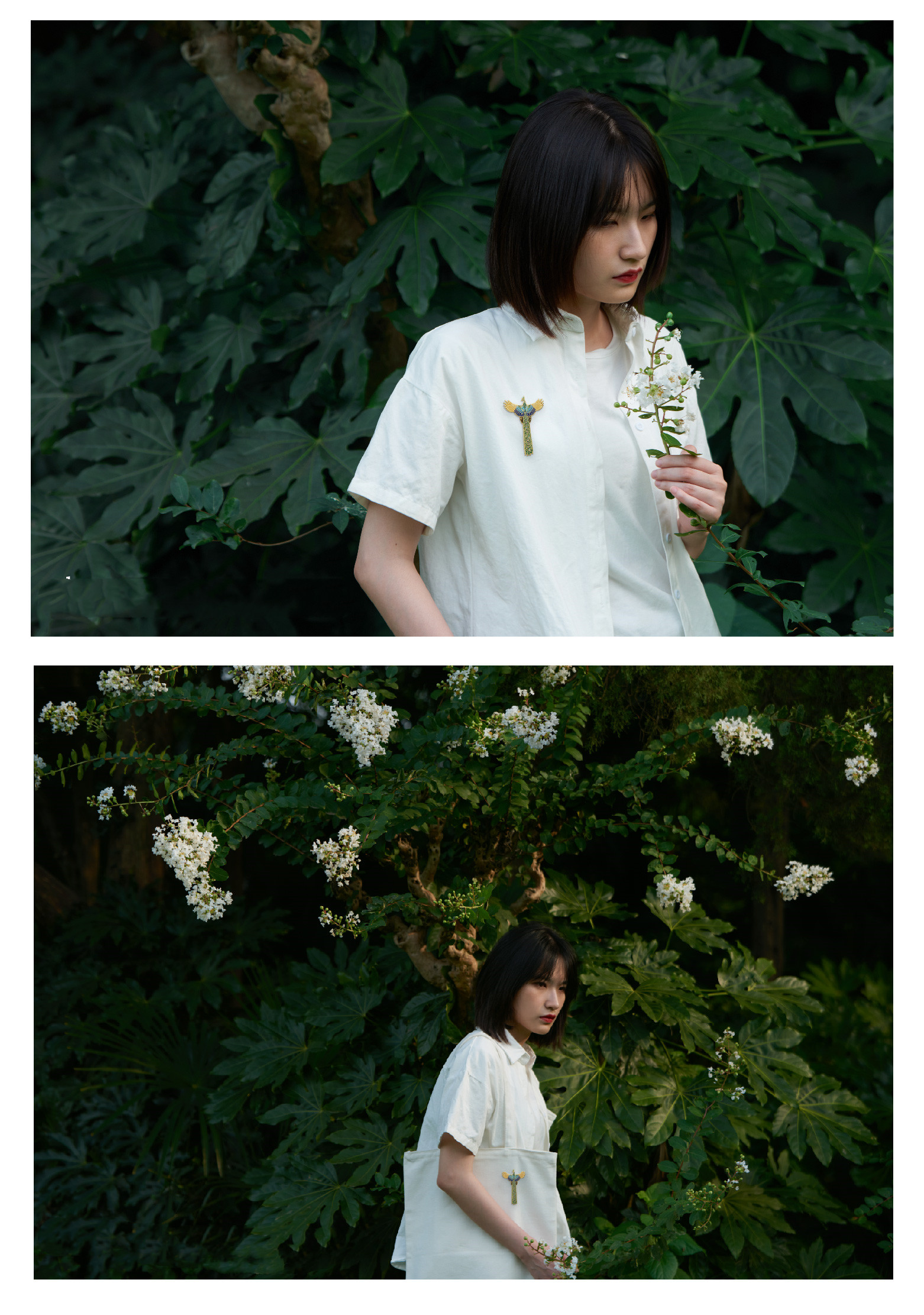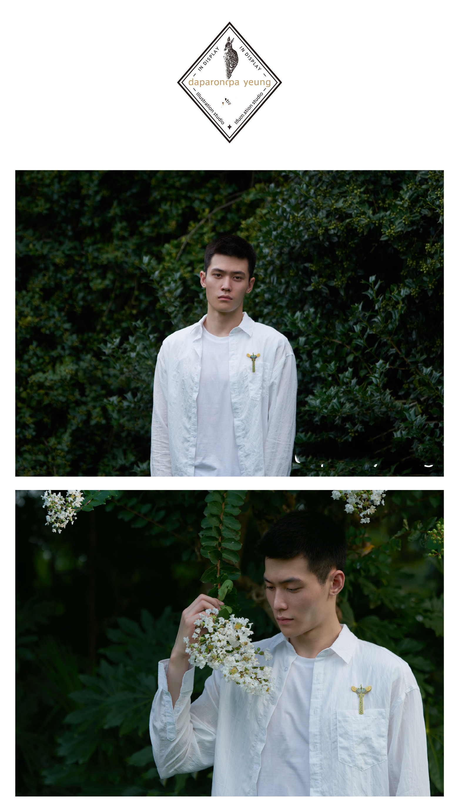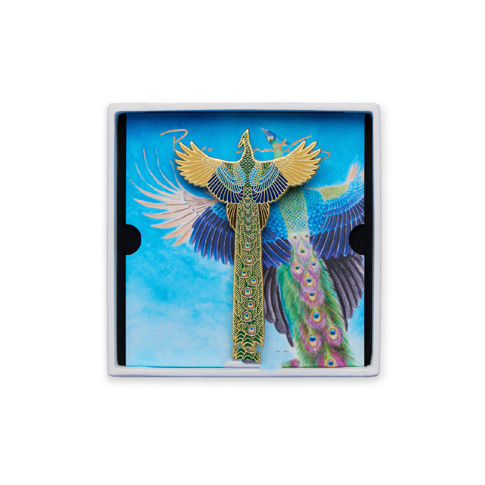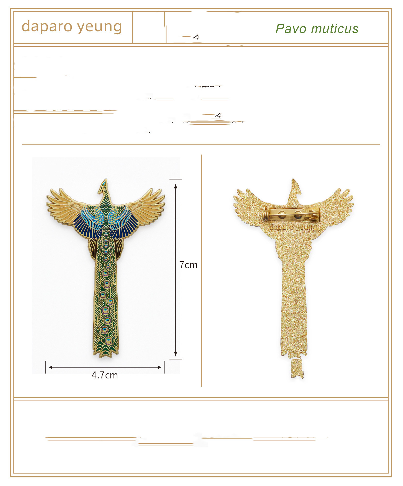 A single product includes a brooch, a product card, and a square box