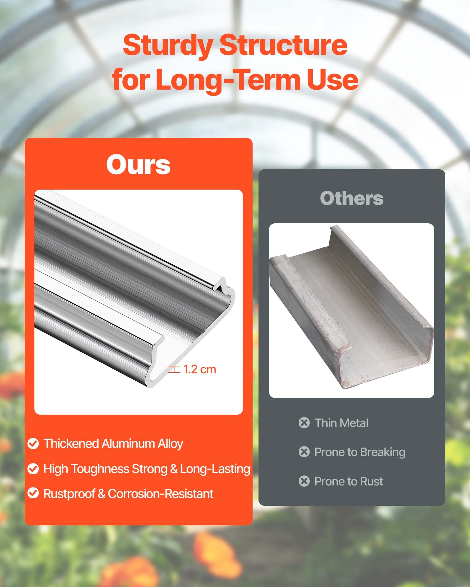 Premium Material: Crafted from aluminum alloy, the greenhouse lock channels are sturdy, resistant to rust and corrosion. Flexible enough to bend and adapt to different greenhouse structures. 6.6 ft long, 1.2 in wide, 0.4 in high, and 0.05 in thick