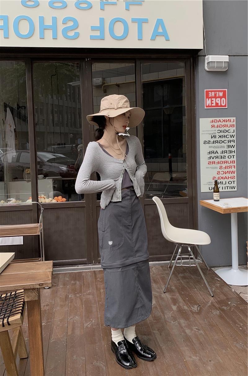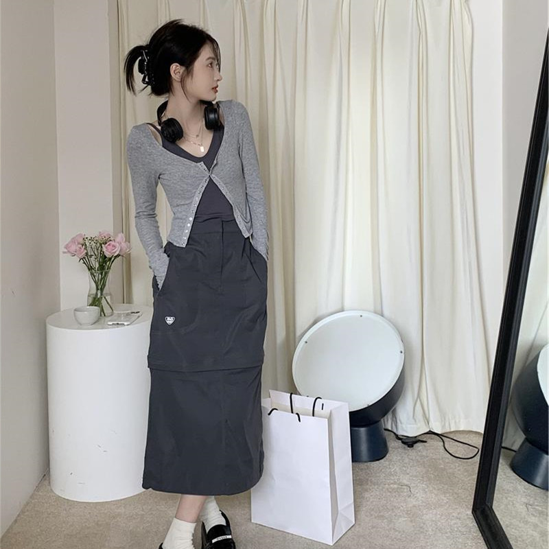 Color: one piece of light gray cardigan, one piece of dark gray suspenders, one piece of dark gray skirt