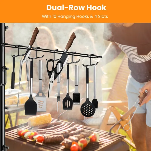 *Upgraded Standing Caddy for BBQ*:The upgraded standing BBQ caddy rack offers a novel solution to maximize vertical storage space while saving more countertop operating space,making everything you need within your reach. Moreover,a higher placement position effectively safeguards against accidental contact with condiments and cooking utensils by children and pets. *Large Storage Capacity*:Come with S/M/L different sizes of baskets,suitable for accommodating various bottles and cans,like chili sauce,pepper,cumin powder,tomato sauce,oil and more. Dual-side hook offers 10 hanging placement for cooking utensils. The paper towel holder is designed with a weighted arm and curved end,which can avoid the paper from sliding out or unrolling,ensuring rolling paper remains securely in place,even in windy condition. *Sturdy & Durable Material*:Constructed by thickened carbon steel with rustproof powder-coating,our durable and sturdy griddle caddy can withstand diverse harsh weather conditions,like snow,heat,rain and so on. *Easy To Assemble The assembly process is definitely effortless,as it only requires connecting the supportive rods and hanging all the accessories,even one person can quickly finish installation in 2 minutes. Hook-up design allows this grill storage rack also simply to take apart and store. Wide Compatibility*:Equipped with a C-shape clamp base,this griddle caddy can be firmly attached to any Blackstone griddle cooking stations,outdoor tables or any other BBQ grill with thickness under 2.28in. A perfect addition to any outdoor party,like BBQ,camping,picnic,family gathering.
