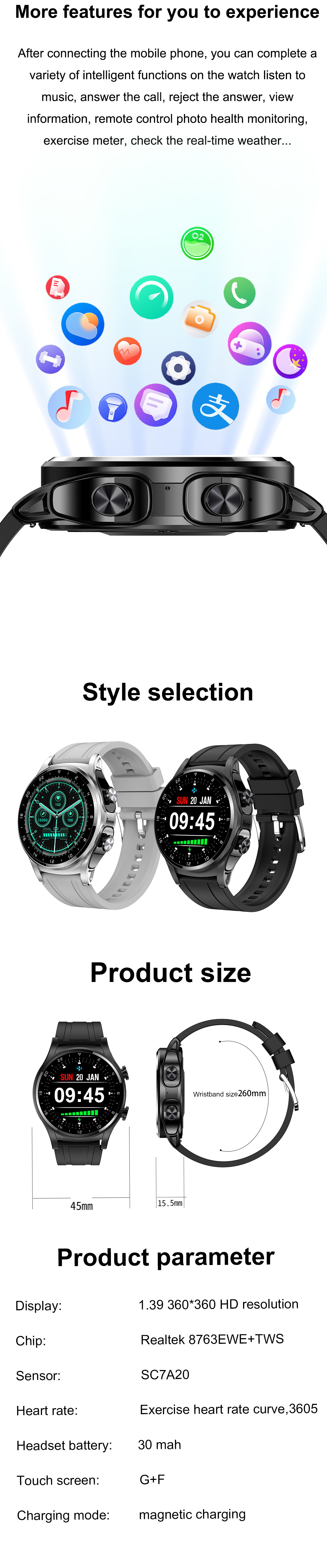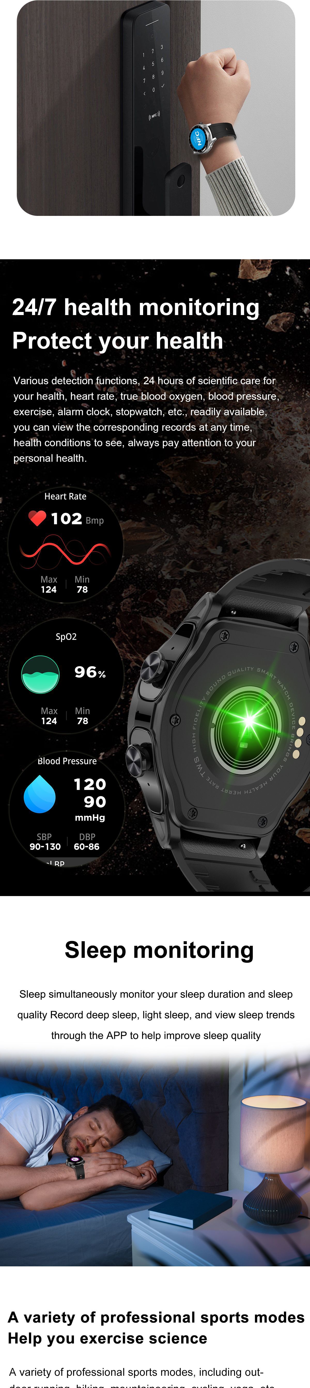 Functions: Waterproof, step counting, heart rate monitoring, blood pressure measurement, Bluetooth call, smart reminder, remote control selfie, sleep monitoring, blood oxygen detection