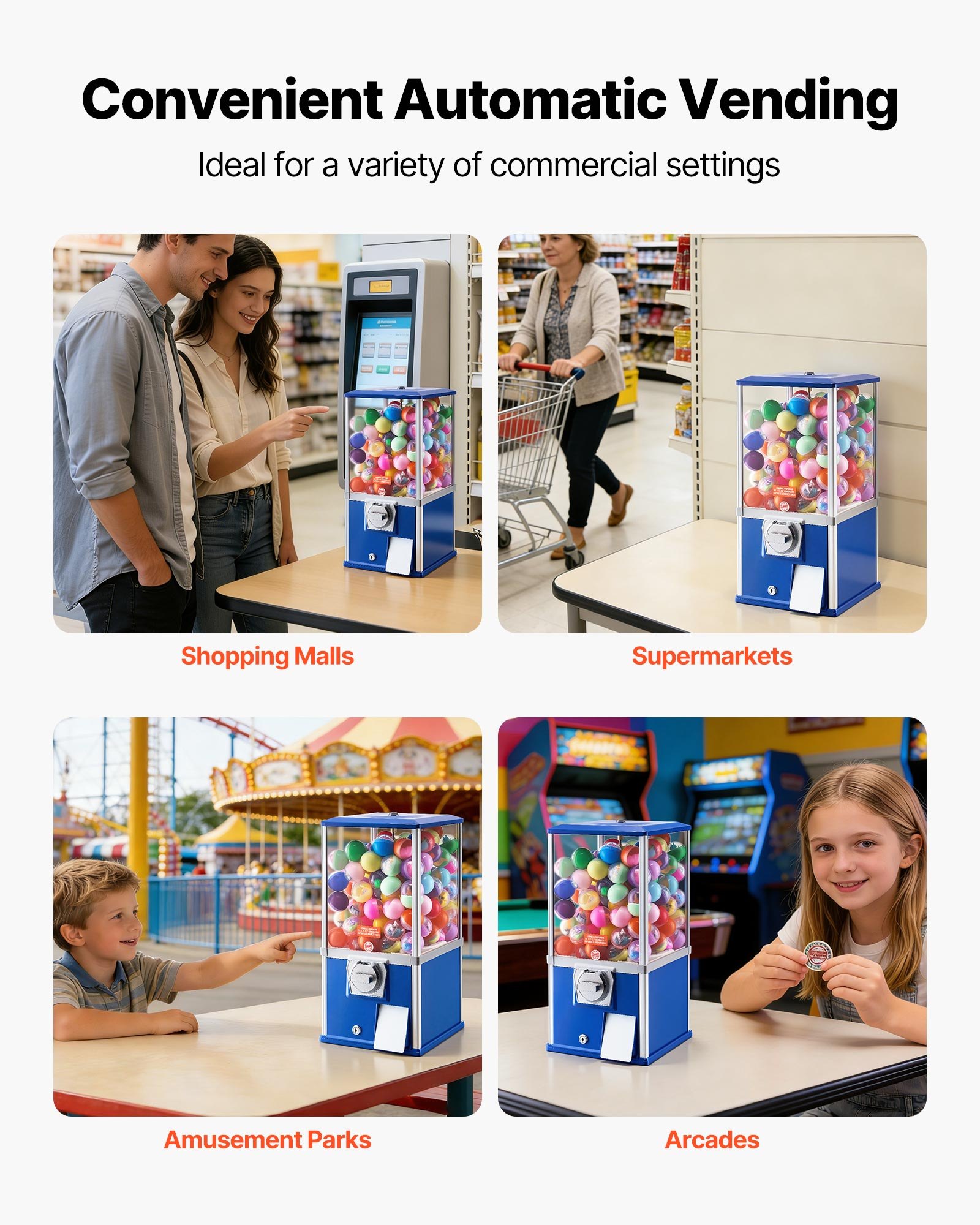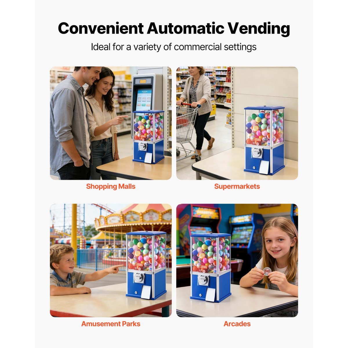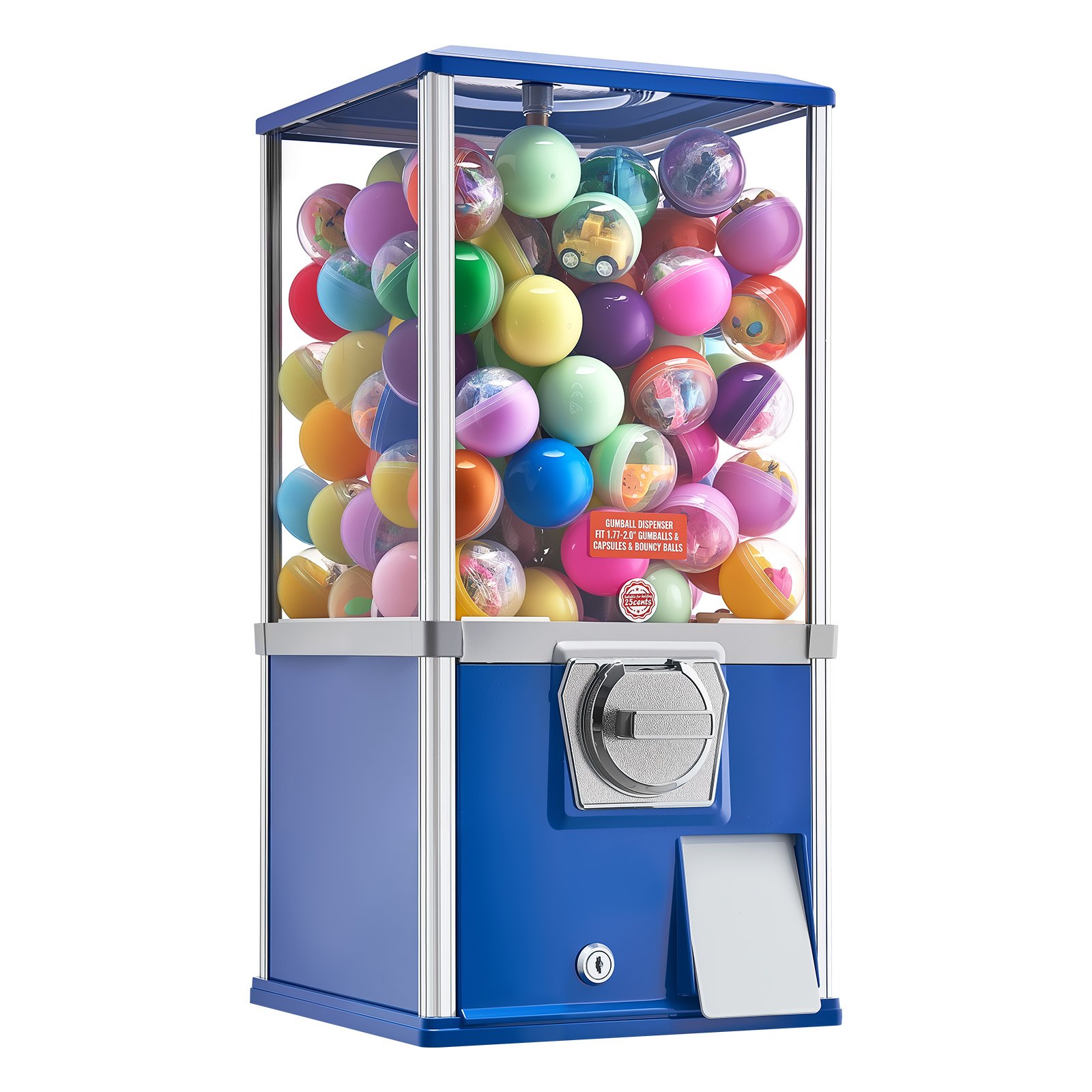 Locking Top Design: This VEVOR candy machine dispenser features a locking top cover that opens only with the key, keeping capsule toys and coins secured from unauthorized access. A metal baffle at the capsule outlet helps slow item release, reducing impact and keeping items from dropping directly onto the floor