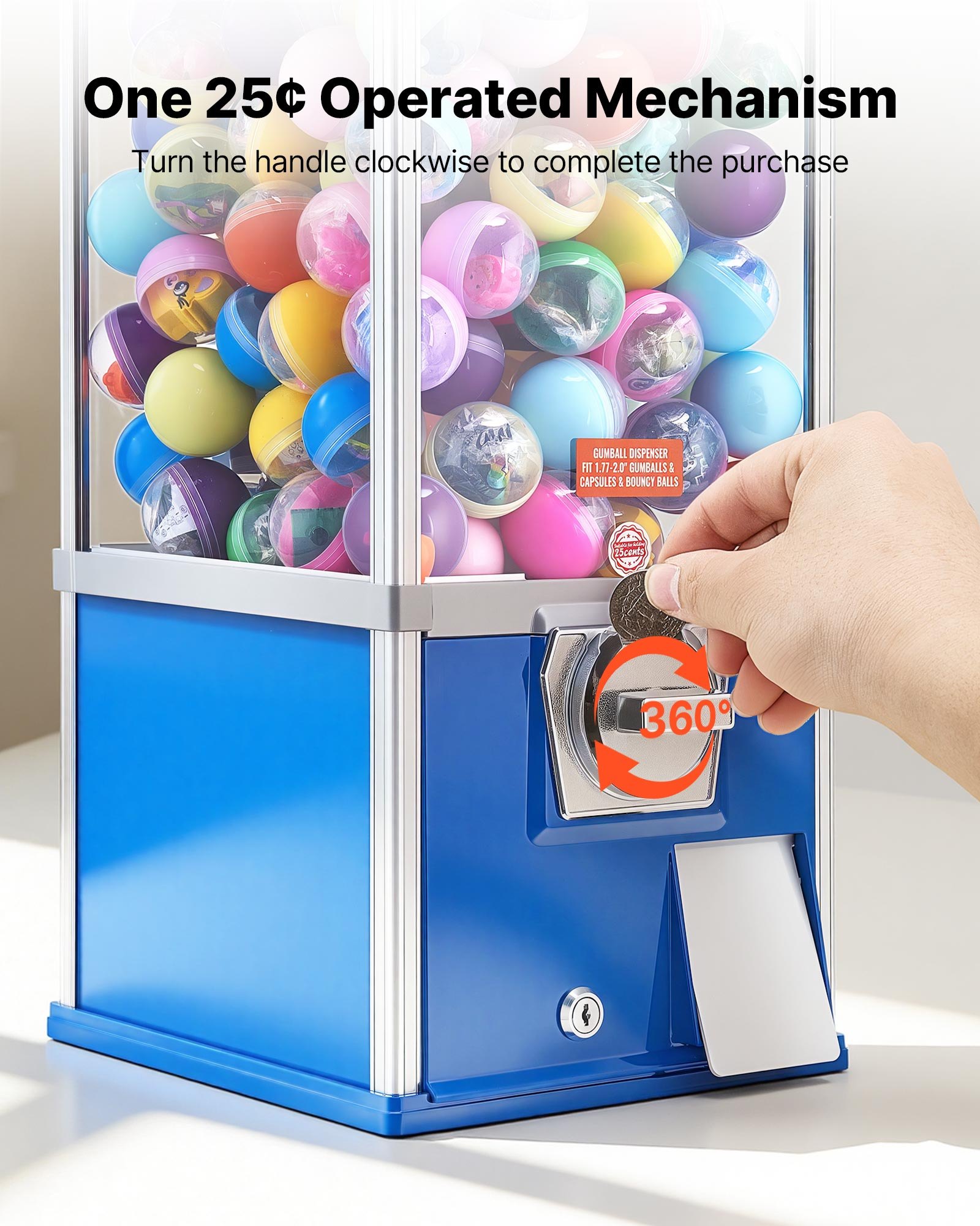 Simple Coin Control: This candy gumball vending machine features a classic coin-based system that runs without electricity. After inserting one 25-cent coin, users rotate the control lever clockwise through a full circle to collect a mini capsule toy from the outlet. The operation is quick, entertaining, and easy