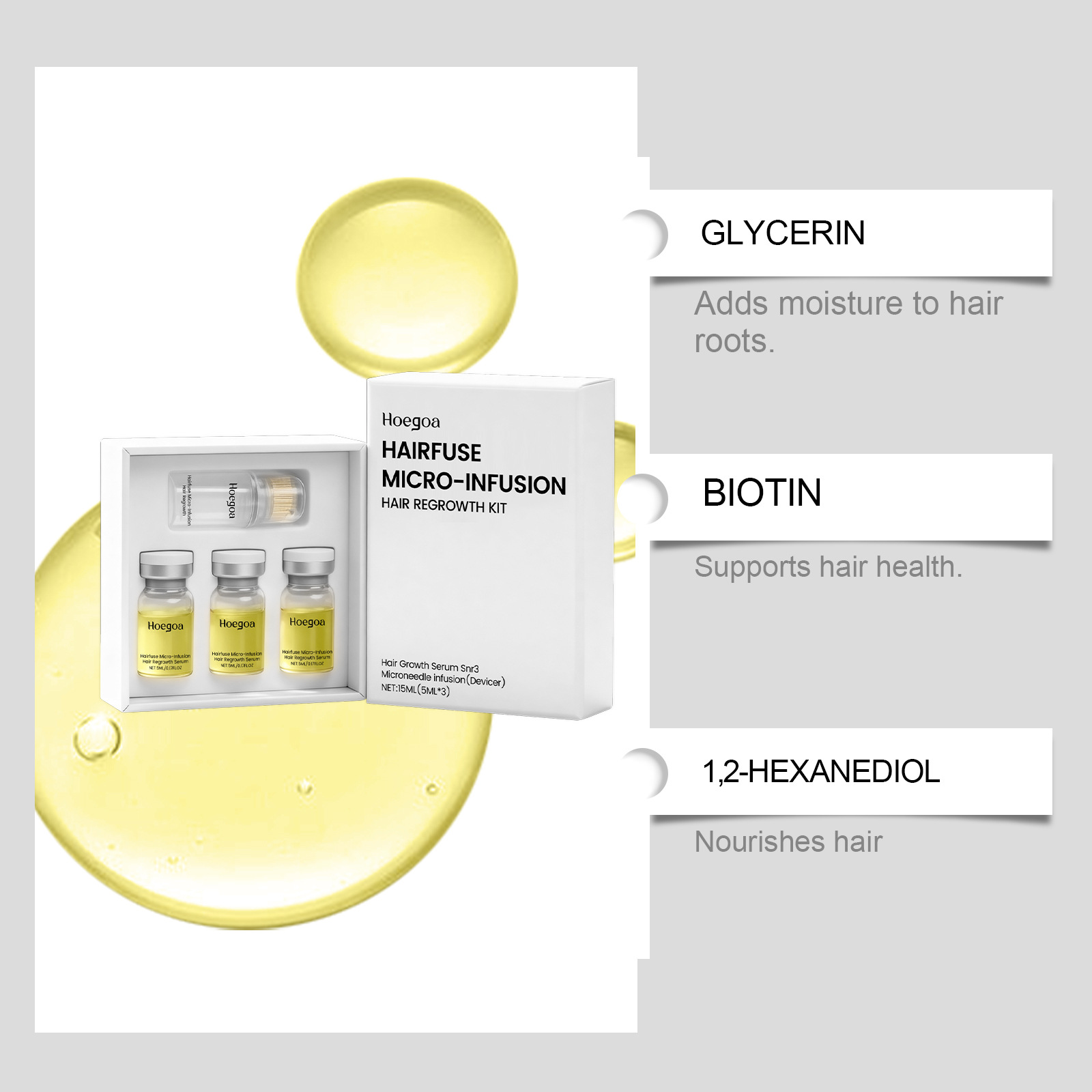 Ingredients: water, glycerin, 1,2- hexanediol, biotin, caffeine.