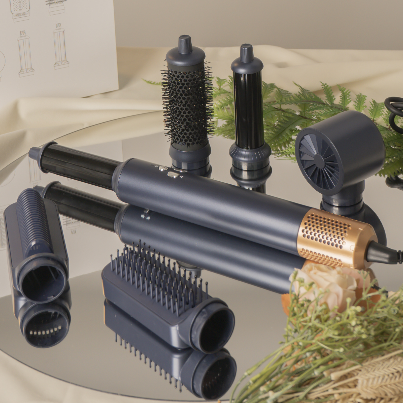 Fluffy comb * 1 Straight comb * 1 Smooth comb * 1 Left and right curlers * 1 Hair dryer nozzle * 1