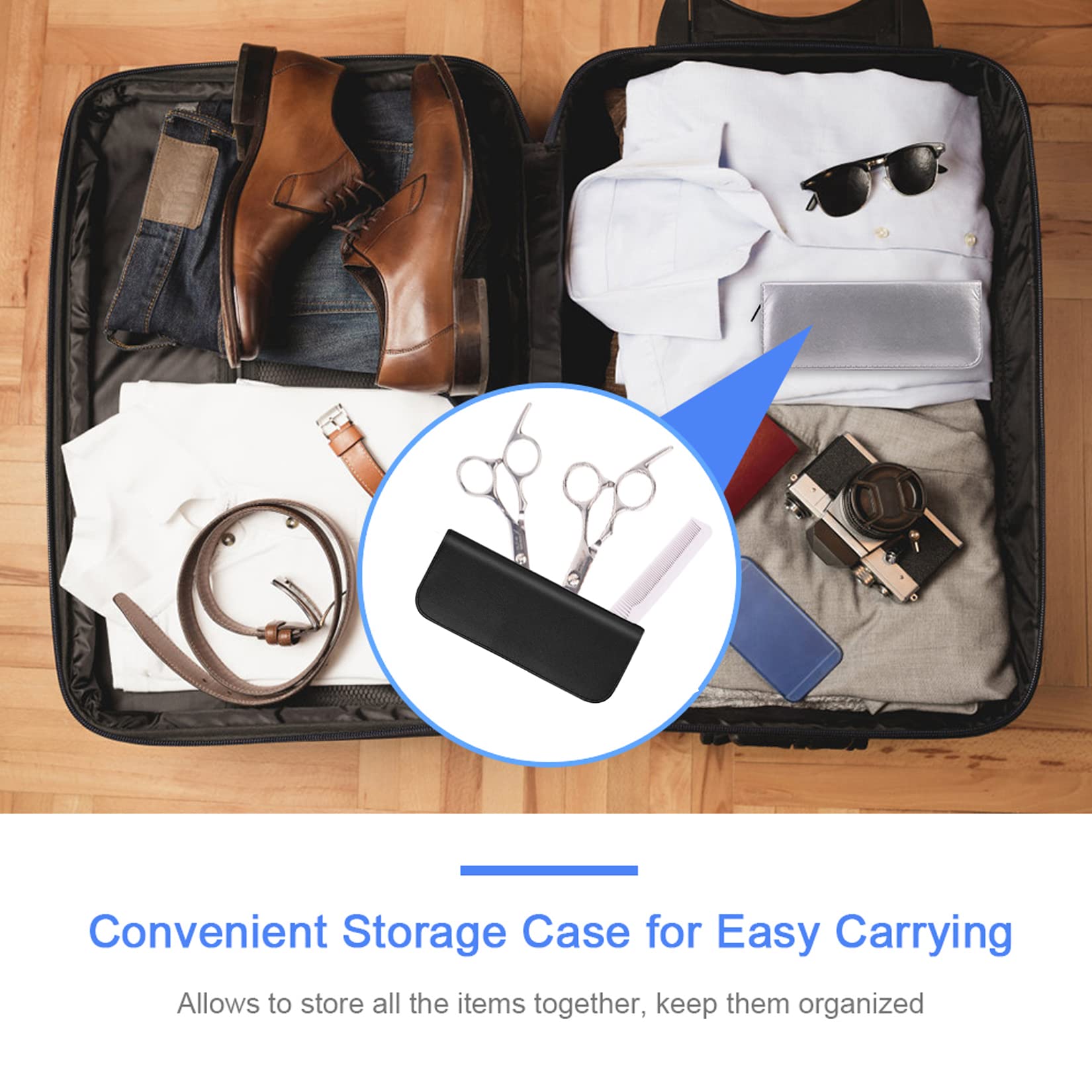 To Help You Get A Better Haircut: The hair scissors kit is come with 1 Hair Scissor ,1 thinning shear ,1 comb , 1 cleaning cloth, 2 clips and 1 leather case.The razor comb is ideal for shortening, shaping and layering thicker hair. The closely and widely spaced tooth comb gives better control over any hair type. The other accessories such as the clips and cloth help barbers with their work and are part of the essential tools in the barber kit.