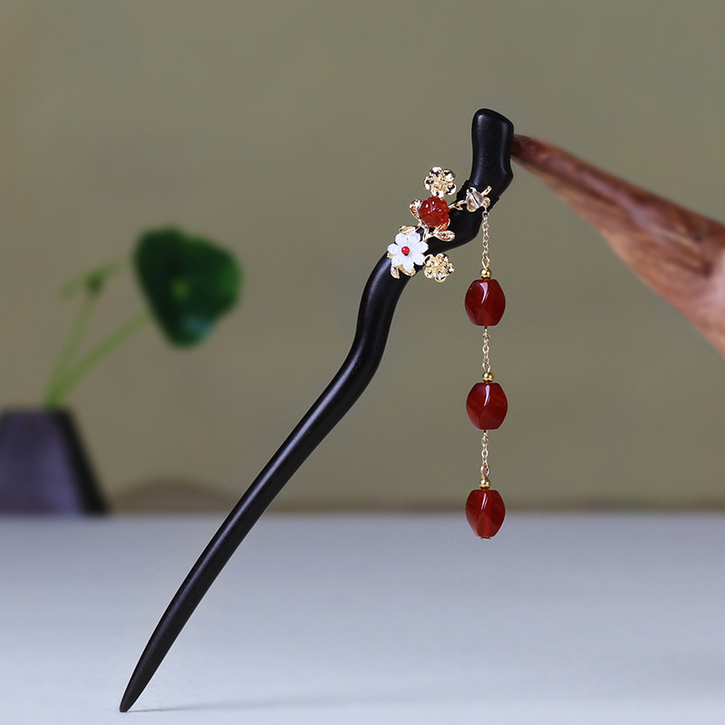 Material: ebony hairpin, Oriental jade flower, shell flower, real gold leaf, powder crystal