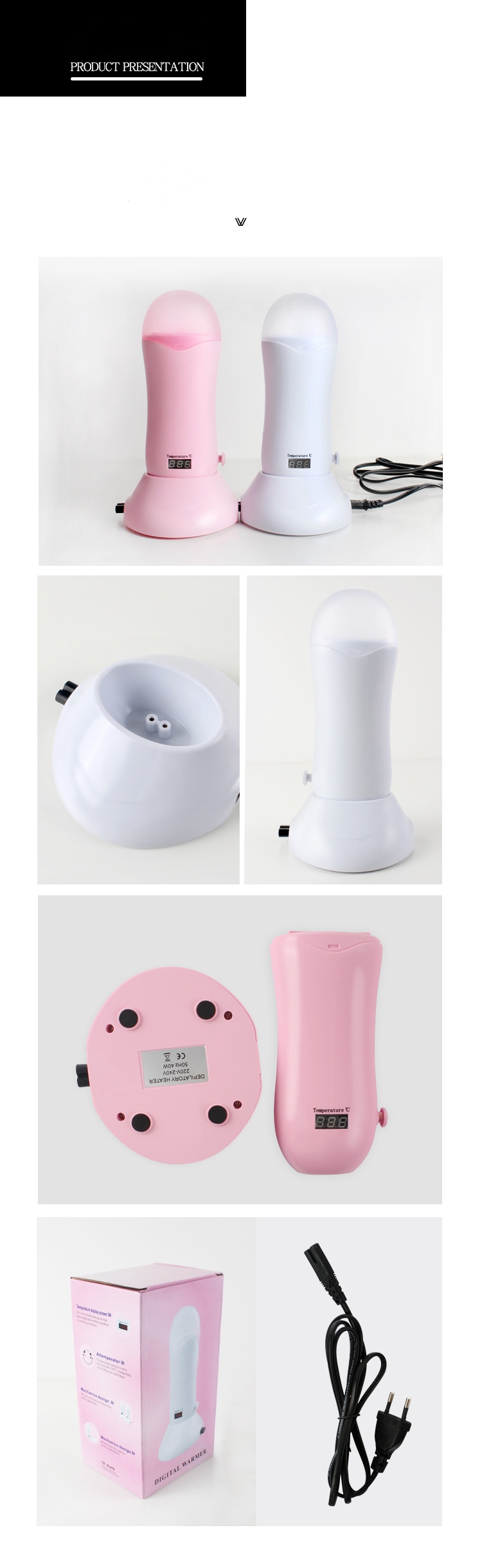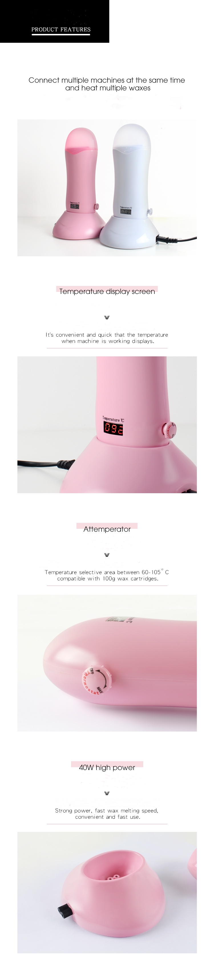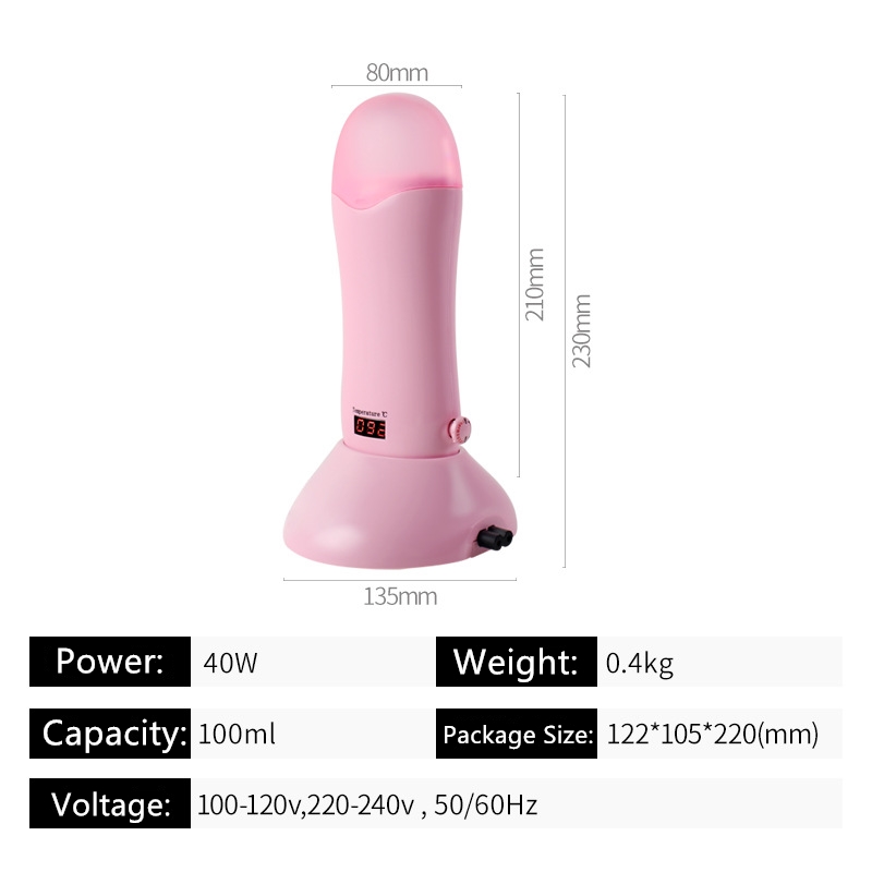 Product Name: Depilatory Wax MachinePower: 40WColor box size: 122*105 *220(mm)Input voltage: 100v-120v/220v-240v, 50/60Hz
