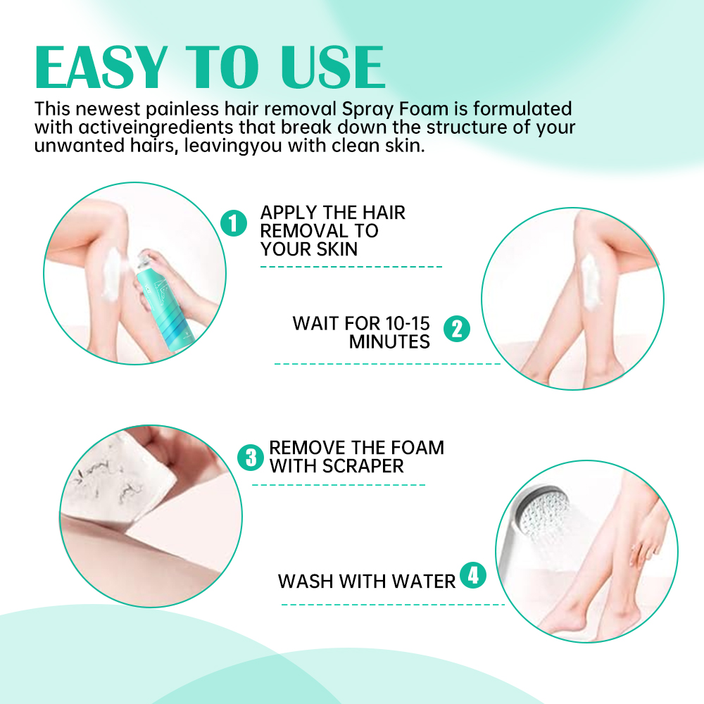 Attention: Before using this product, clean the skin first, then gently shake the product 3-5 times, 15-20cm away from the target area, evenly spray on the fine hair areas of the arms, feet, and armpits, keep still for 8-10 minutes, wipe clean with a tissue or rinse with water.