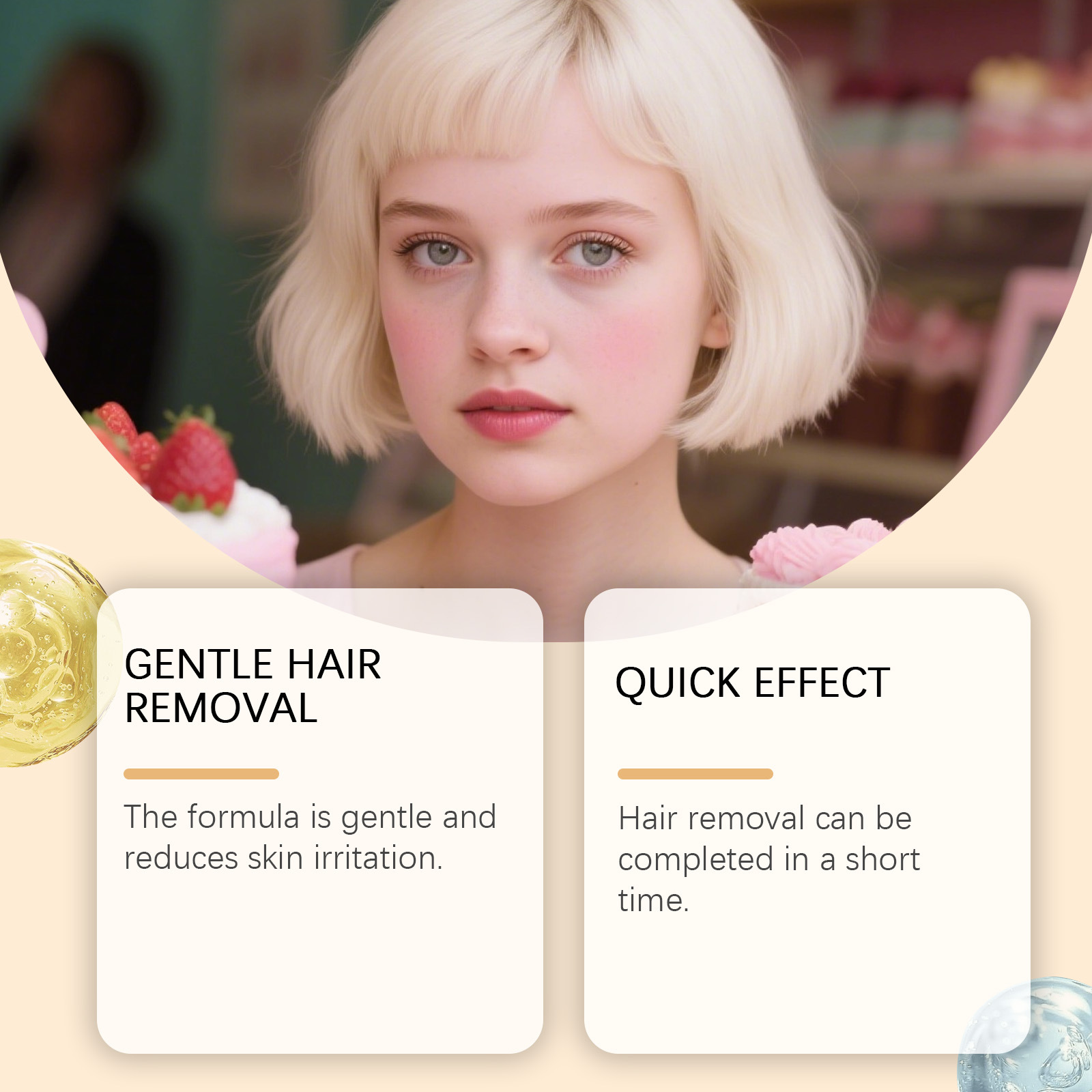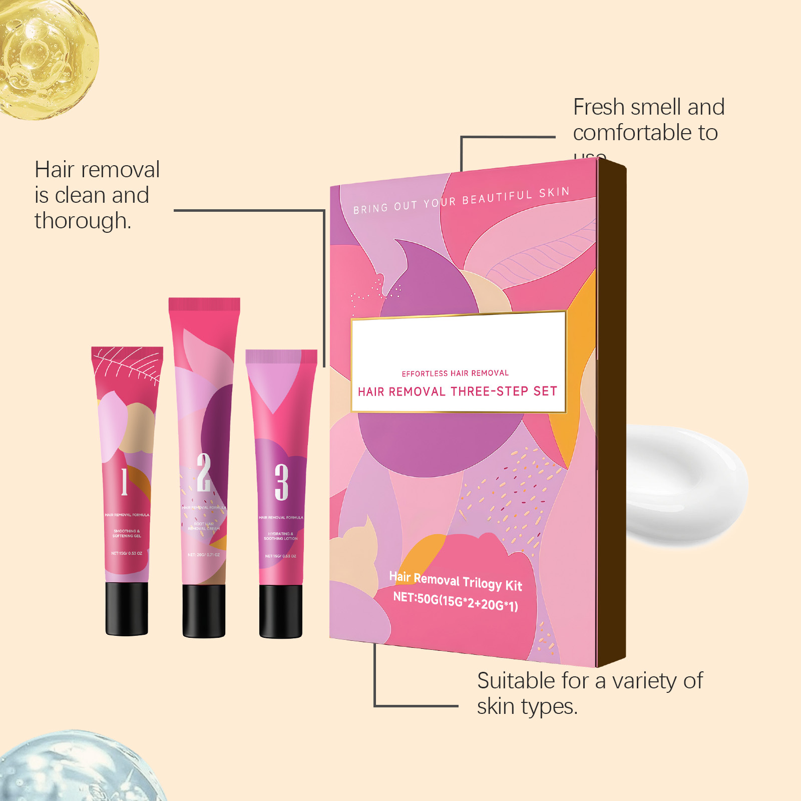 Depilating cream: water, glycerin, mineral oil, thioglycolic acid, panthenol, petrolatum, glyceryl stearate, shea butter, potassium hydroxide, 1,2-hexanediol, carbomer, arginine and tocopherol (vitamin E)13.