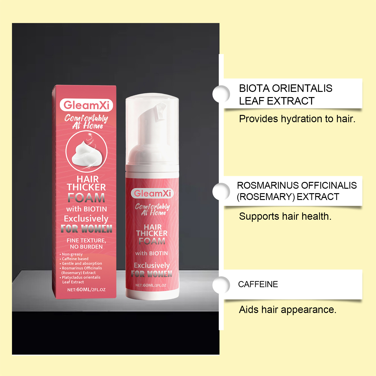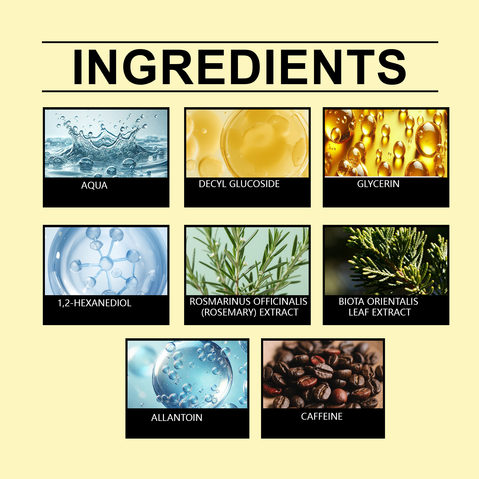 Ingredients: water, decyl glucoside, glycerol, 1,2-hexanediol, allantoin, caffeine, rosemary extract and arborvitae leaf extract.
