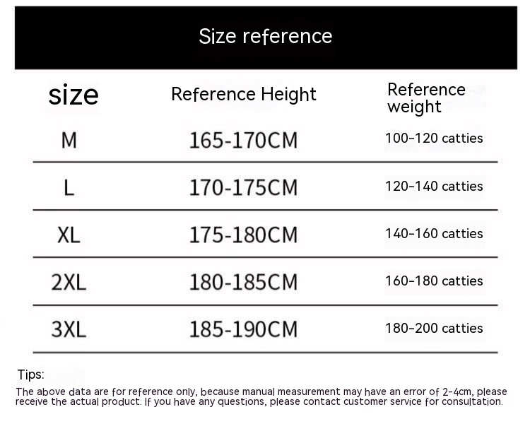 Size: M (recommend 80 kg-100kg),L (recommend 100 kg-120kg),XL (recommend 120 kg-140kg),XXL (recommend 140 kg-160kg),3XL (recommend 160 kg-180kg)