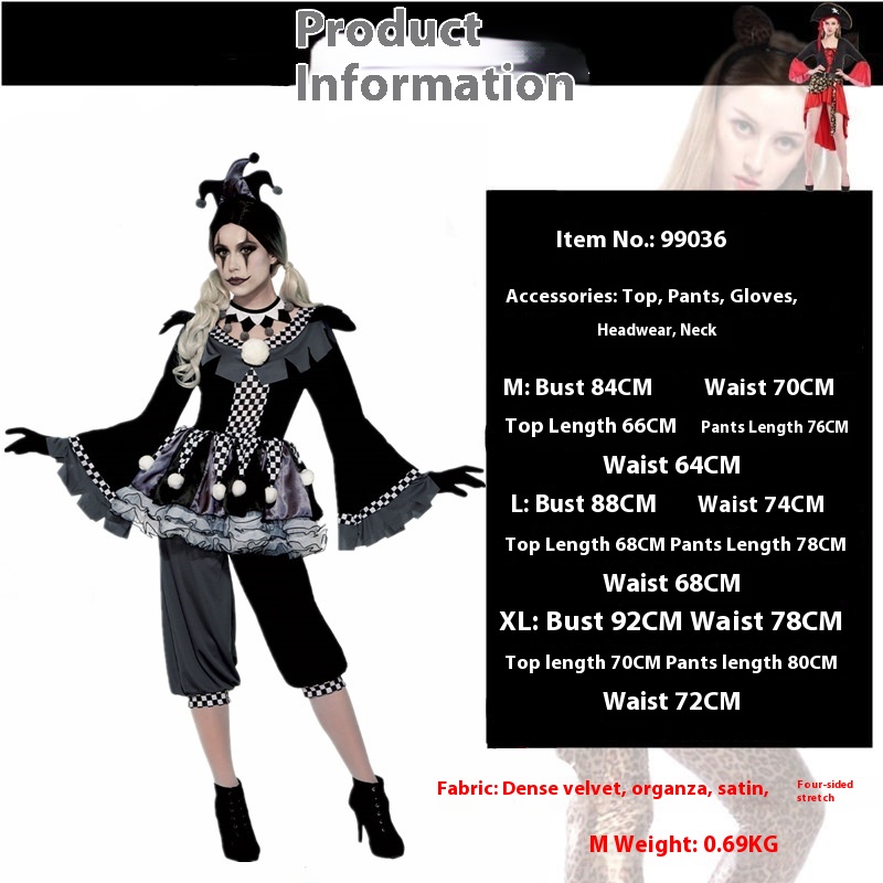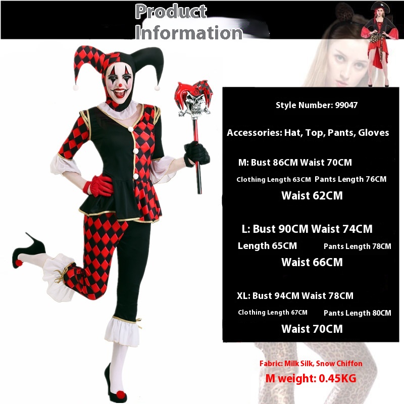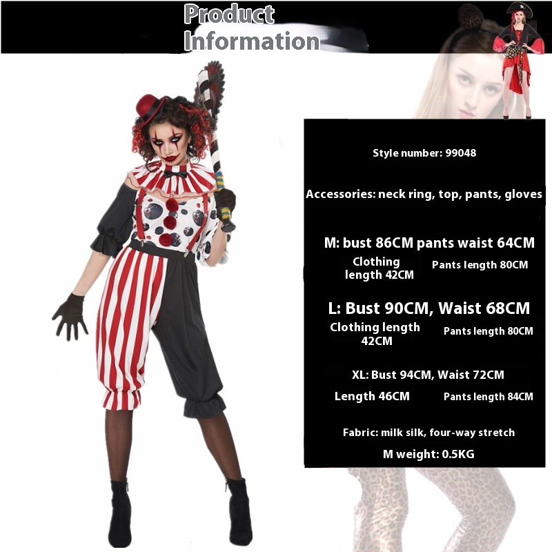 Color: 99036 ugly female adults, 99037 ugly male adults, 99047 ugly female adults black and red plaid, 99048 ugly female adult overalls suit, 88002 clown children rainbow skirt suit