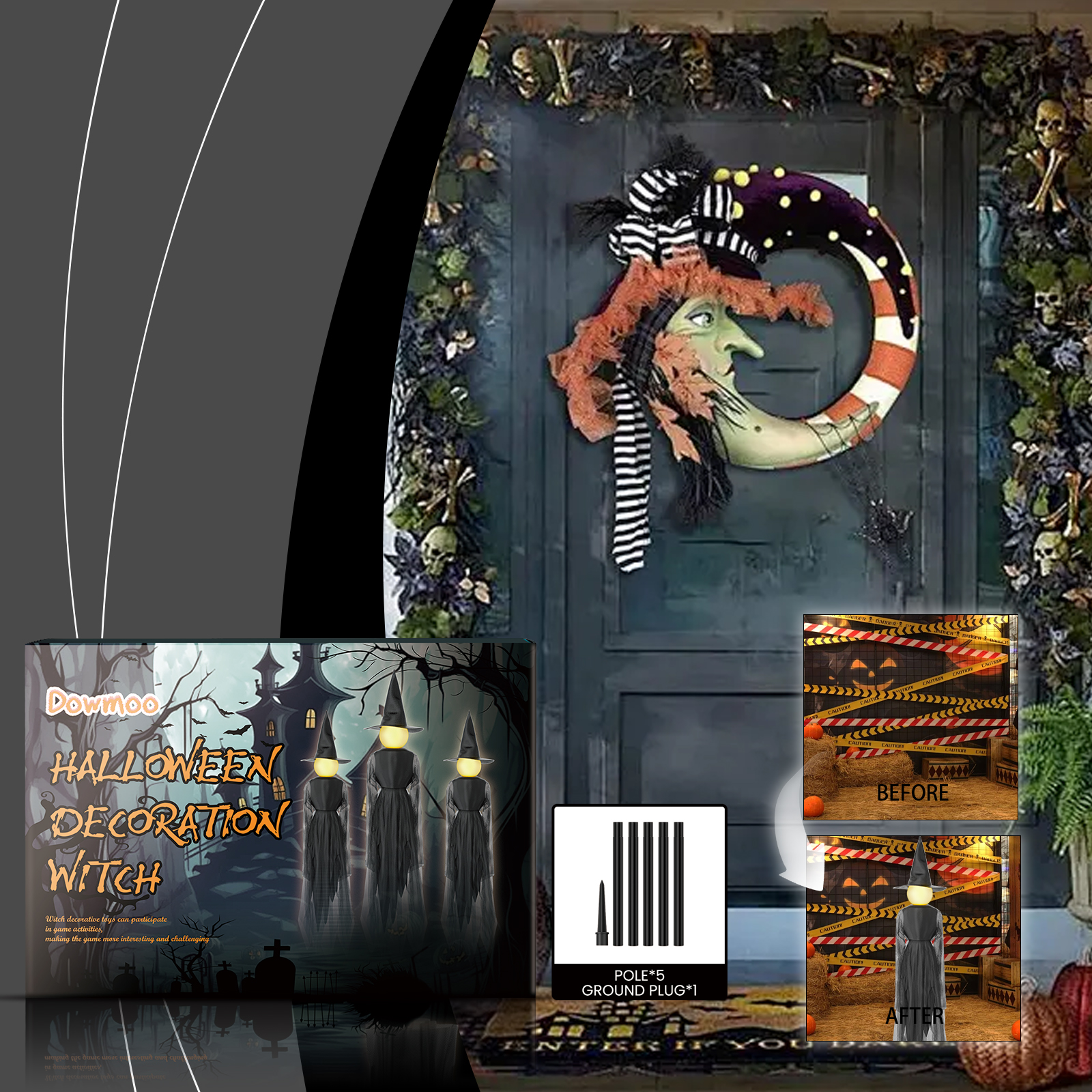 Our Halloween witch ornament contains PP plastic, non-woven fabric, and mesh. It can add texture and touch to decoration, add mystery and terror, and create a Halloween atmosphere. Its usage is simple: splice the poles together to install a ground plug, insert it directly into the soil, and finally place a decorative witch on the pole. It can be used as a must-have decoration item to create a strong festive atmosphere, allowing family members to spend an unforgettable holiday in joy.