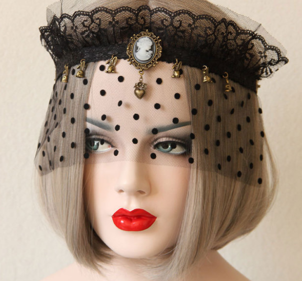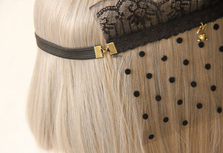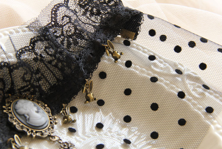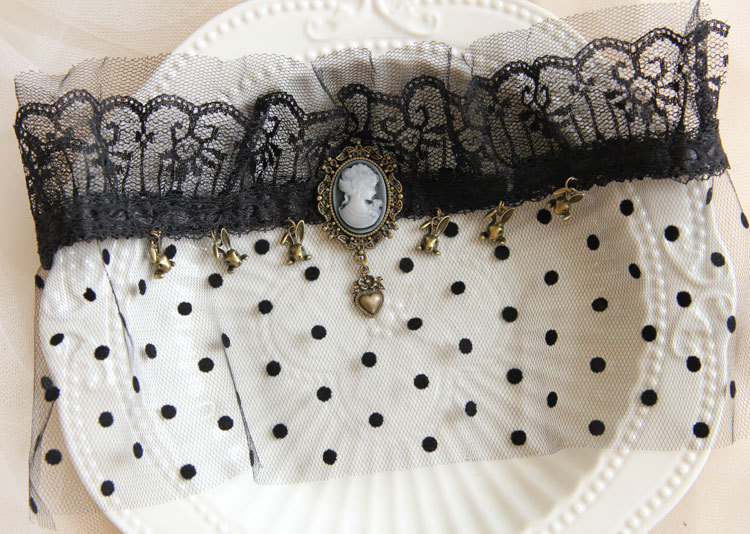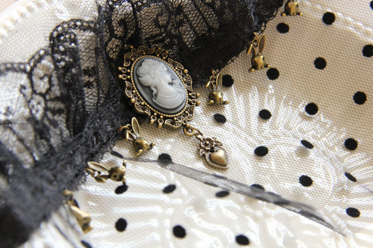 Material: Black lace,Mesh,Bronze alloy accessories,Resin Rhinestone,Elastic rope。