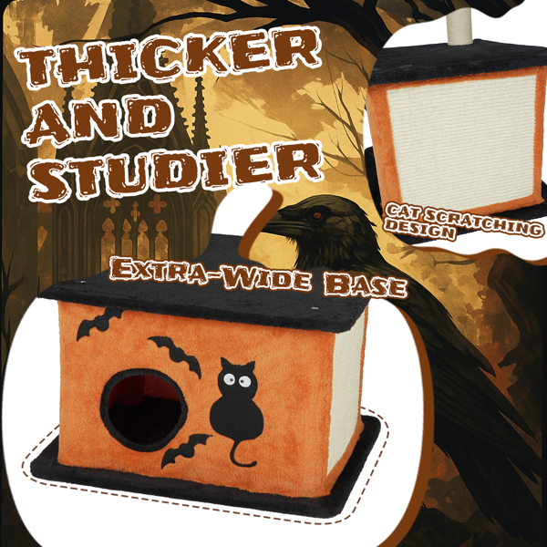 Create a cozy yet spooky playground for your feline friend with this Halloween Cat Tree. Designed in festive black and pumpkin-orange tones, this 2-level cat tower blends seasonal charm with practical features your cat will love. With a spacious lower cat condo, a large middle platform, and a top perch, this tower offers plenty of room for lounging, climbing, and exploring. The sisal-wrapped scratching post satisfies natural scratching instincts, while the extra wide base ensures safety and stability. Perfect for Halloween décor and everyday cat comfort.