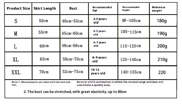 Suitable height: S(2-3T),M(4-5Y),L(6-7Y),XL(8-9Y),XXL(10-12Y)