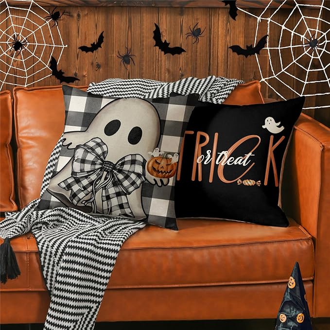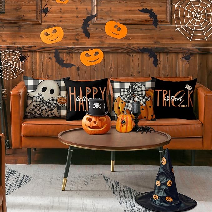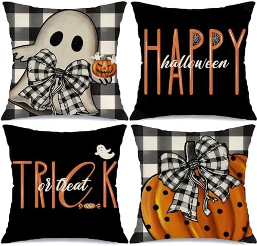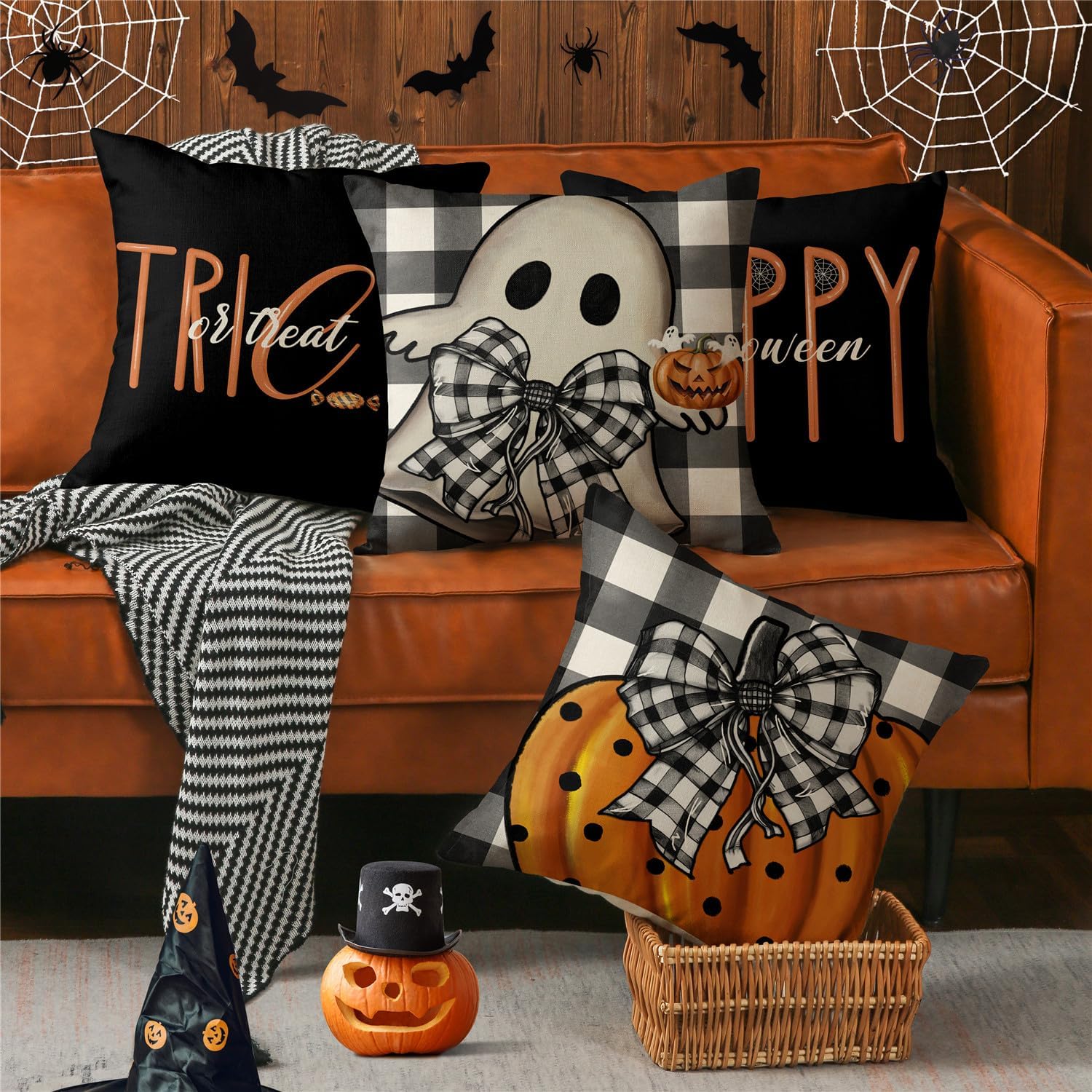 Halloween Decorations Pillow Covers 18x18 Set Of 4 Spooky Pumpkin Throw Pillow Covers Indoor Outdoor Buffalo Plaid Fall Decorative Pillow Covers Trick Or Treat Cushion Cases For Sofa Couch