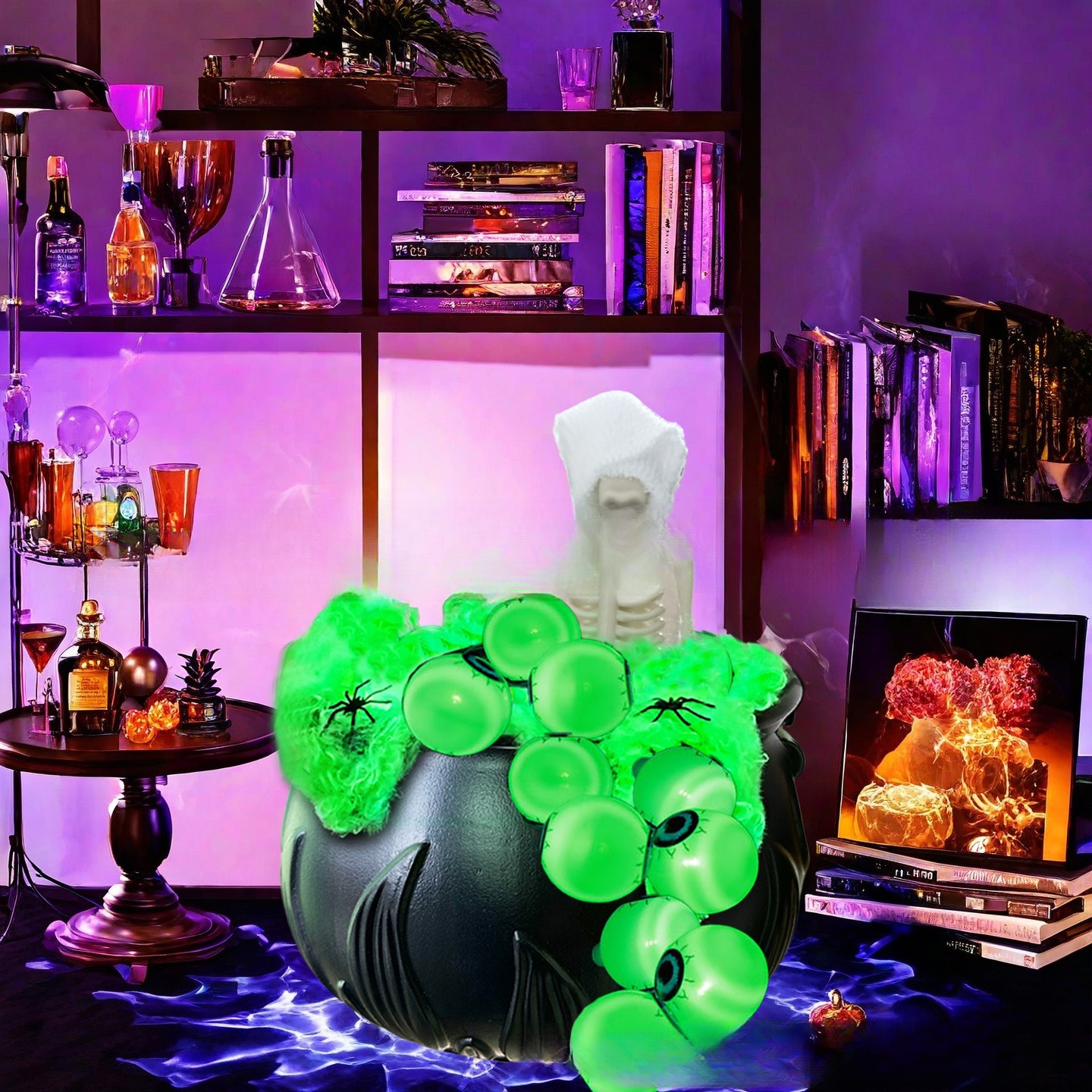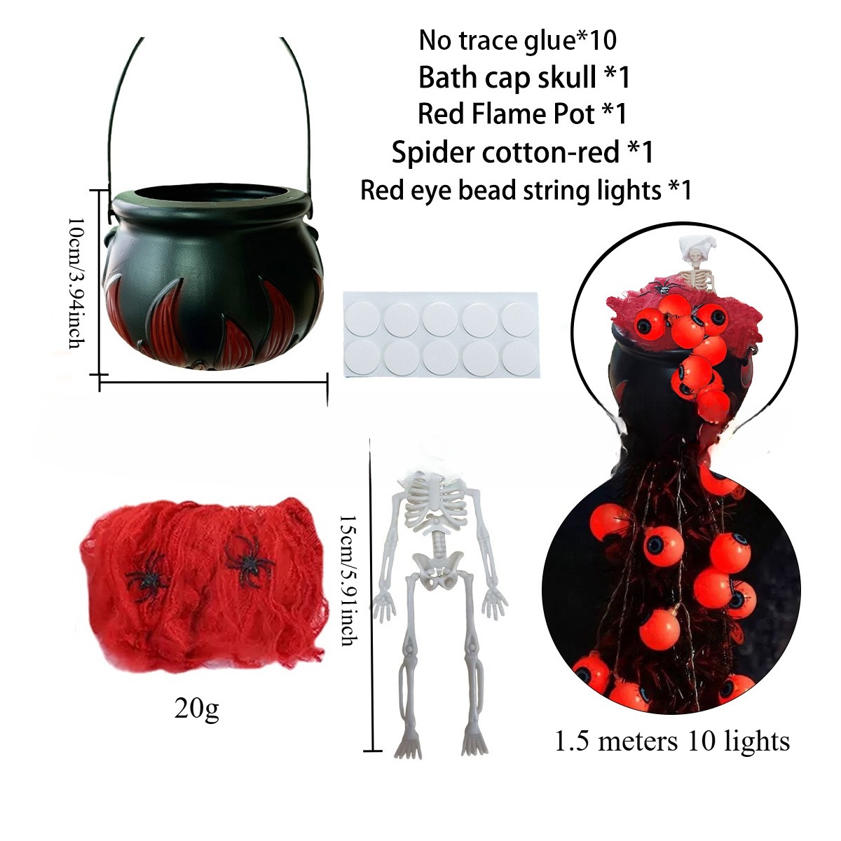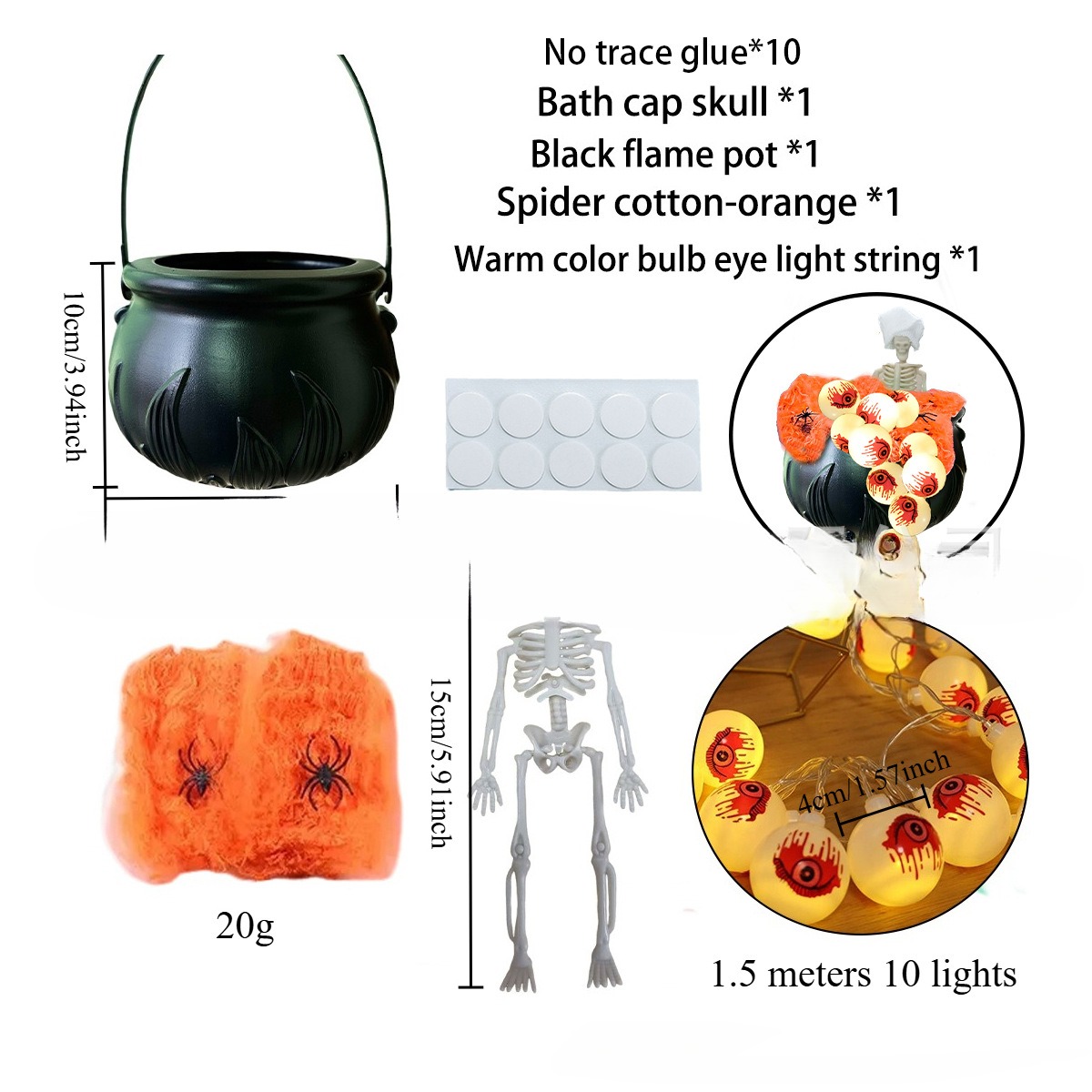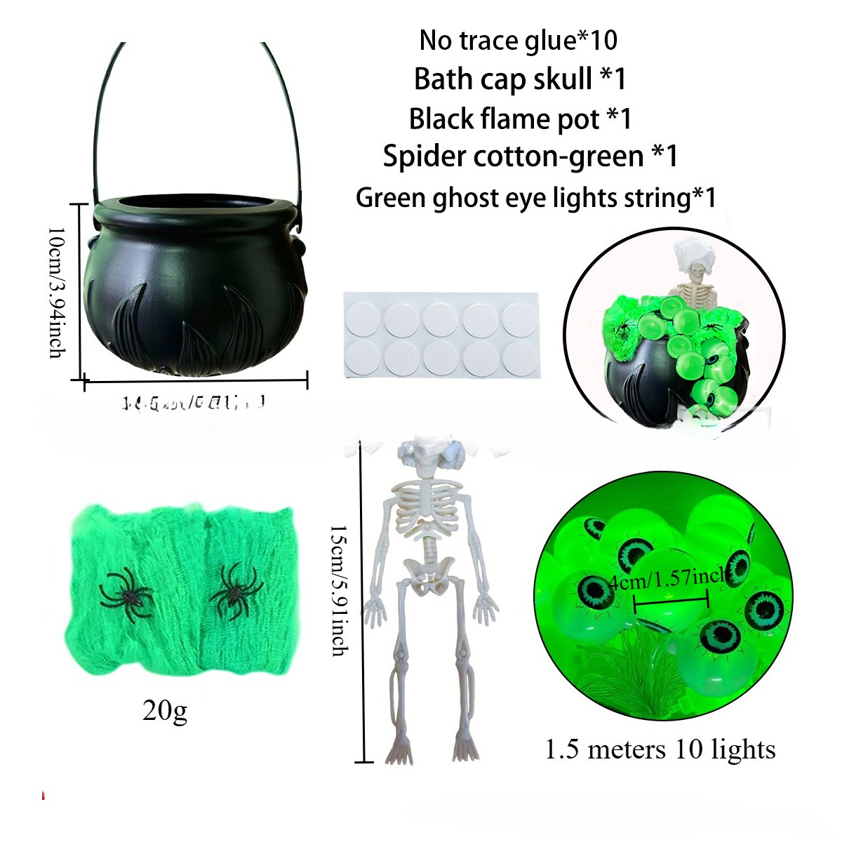 Note:The light string will use 2 AA batteries, which are not included in the delivery. Packing list: No trace glue*10pcs+Bath cap skull *1pcs+Black flame pot *1pcs+Spider cotton-green *1pcs+Green ghost eye lights string*1pcs Product Image: