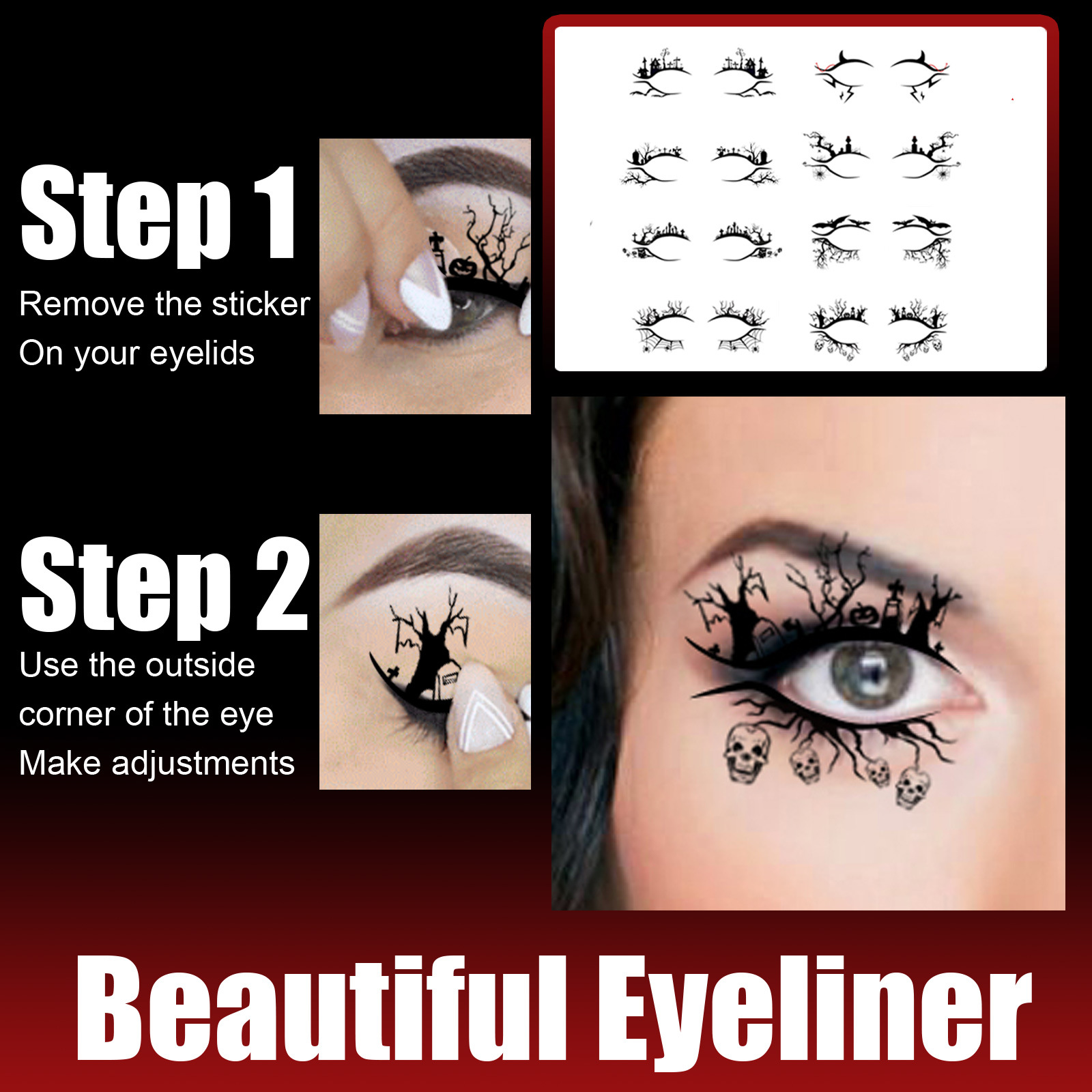 Our Halloween eyeliner stickers contain chemical fibers. It can fit into everyday makeup with a black eyeliner, adding to your personal charm after use. It's easy to use: Remove the stickers from your eyelids, apply Halloween eyeliner, and then adjust the outer corners of your eyes. After use, it can make your eyes become more distinctive and become the brightest presence at the party.