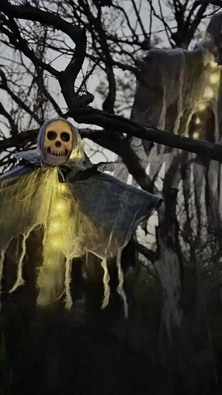 (gloomy) and terrifying atmosphere at night, which is very suitable for the Halloween theme. When night falls, the faint light emitted by the skull, combined with the ghost hanging and fluttering in the wind, seems to bring the scenes from horror movies into the real courtyard.