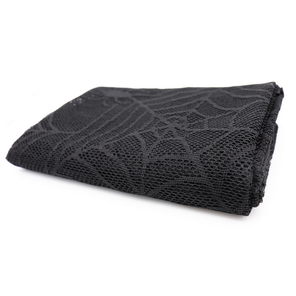 Black lace rectangle tablecloth features spider web design.