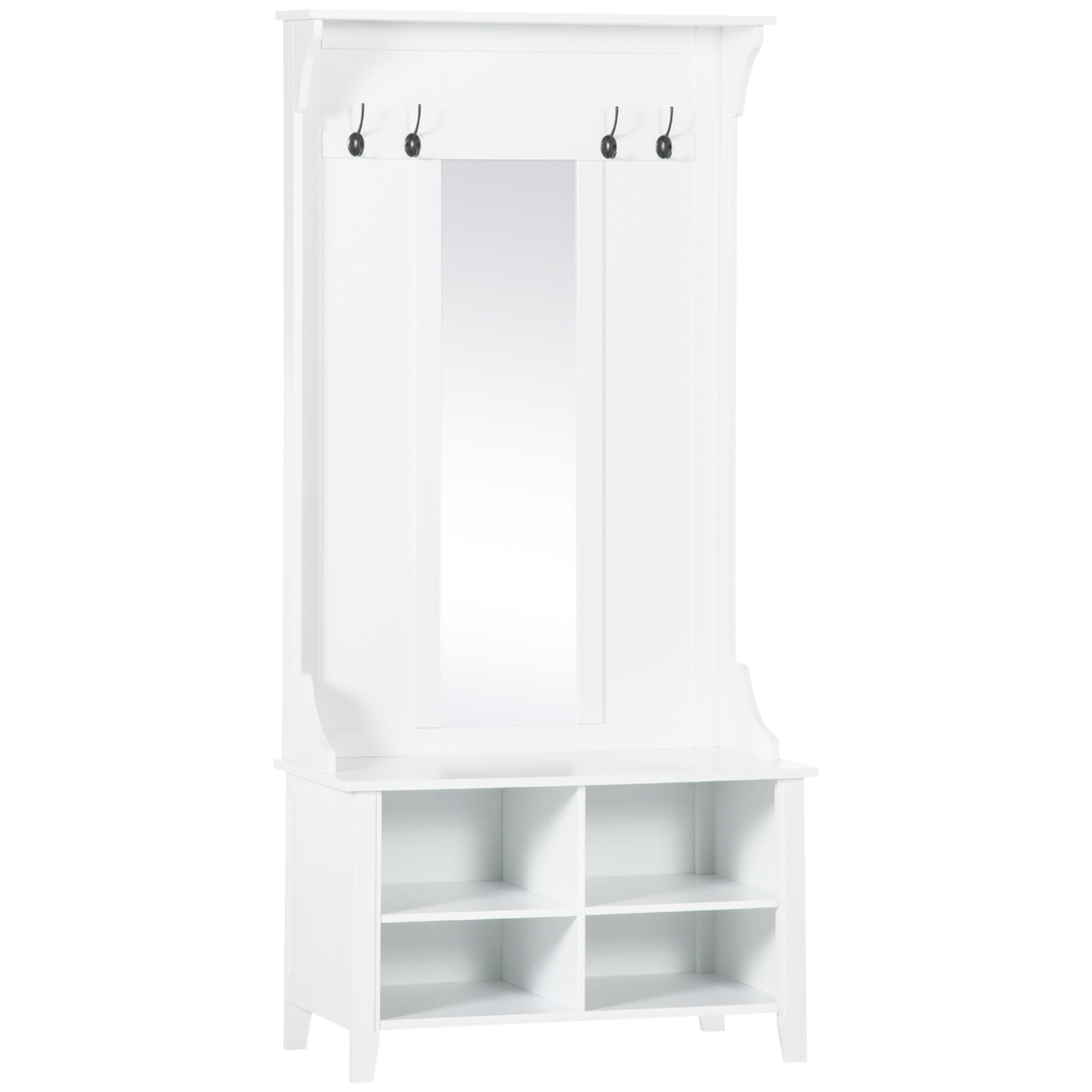 Keeping shoes, bags, hats, shoes and other accessories together has never been so easy thanks to this hallway unit from . Crafted into an elegant design with 4 shoe slots, 4 coat racks, a large surface top and a longline mirror. Anti-tilt devices on the back ensure it keeps securely in place, making it great for when family and friends visit. Finished in a fresh and versatile white hue, it will work perfectly with many style decors and you'll love having it as part of the furniture.