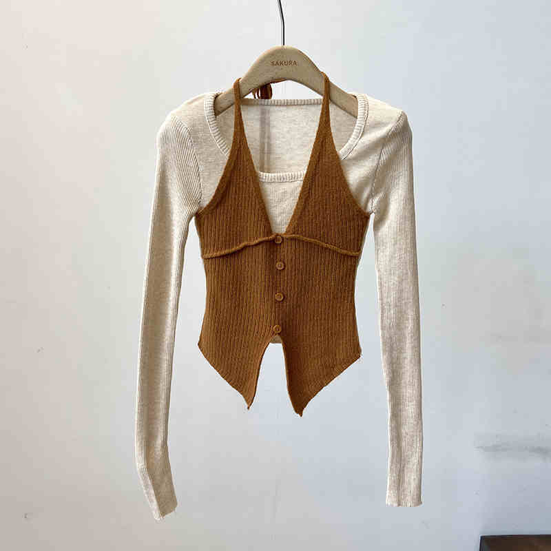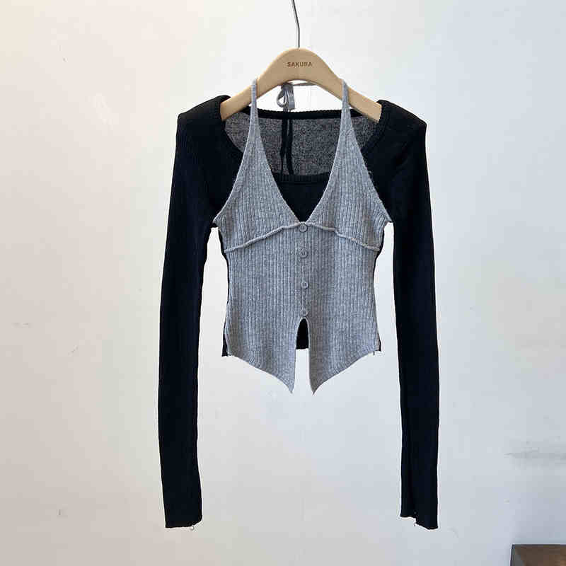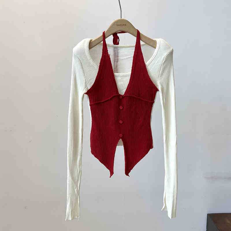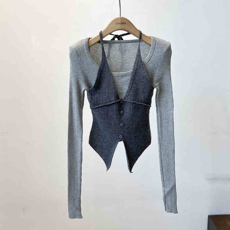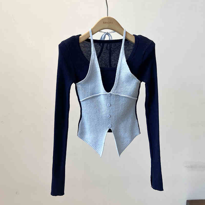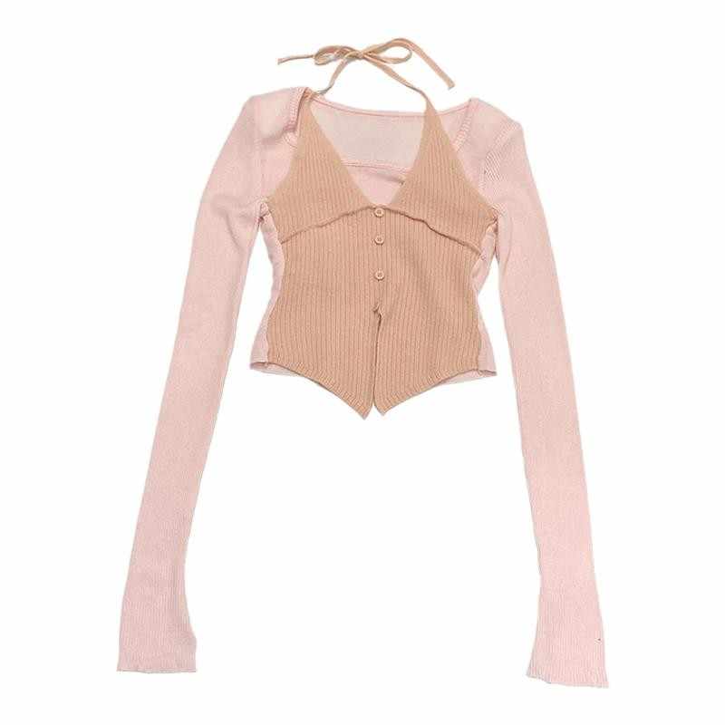 Halter False Two-piece Patchwork Long Sleeve Knitwear T-shirt Top