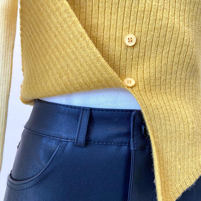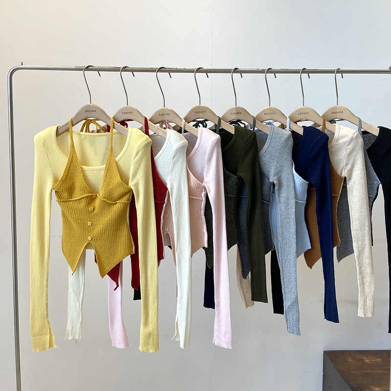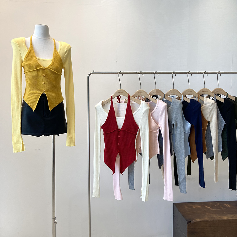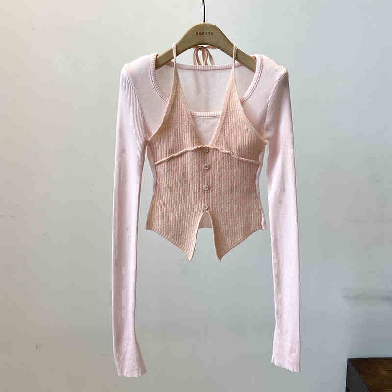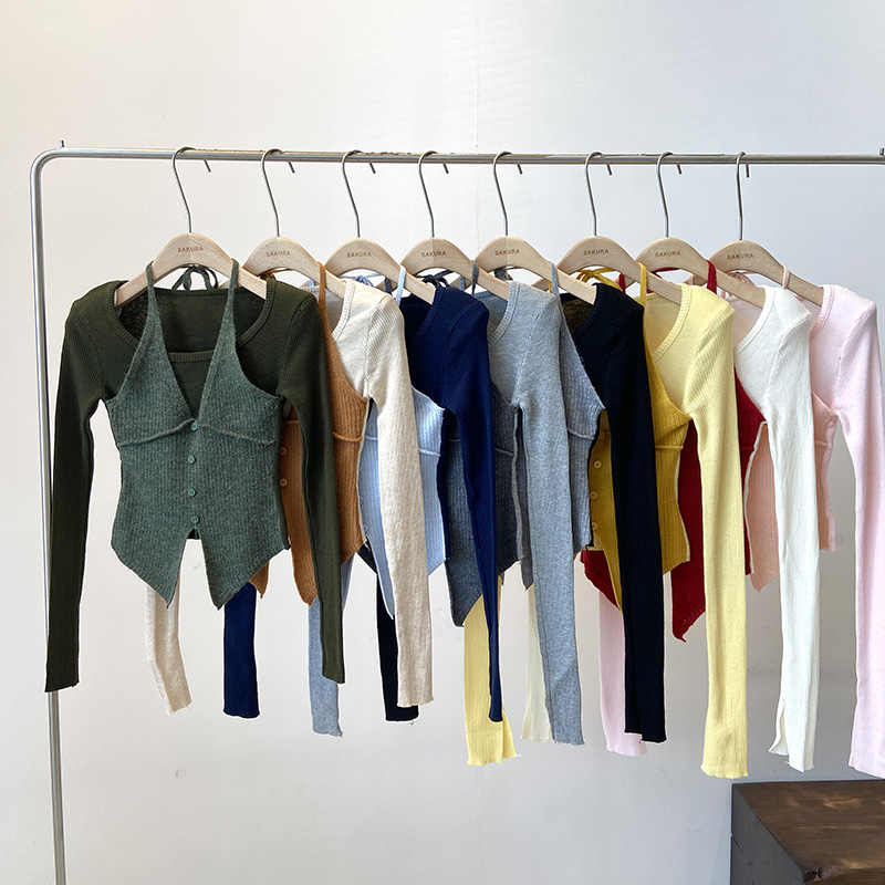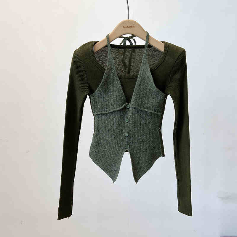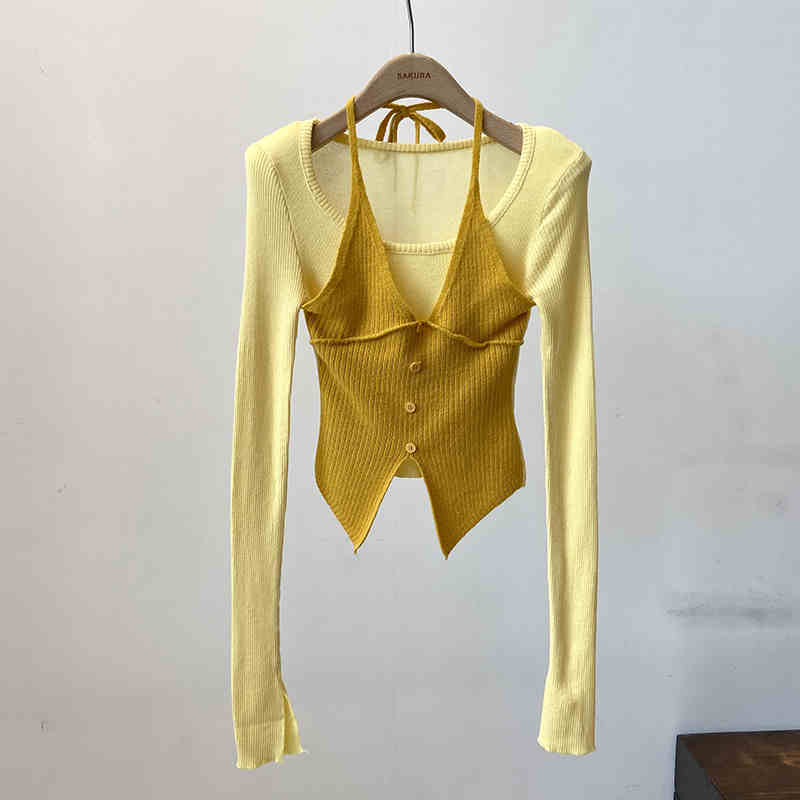 Halter False Two-piece Patchwork Long Sleeve Knitwear T-shirt Top