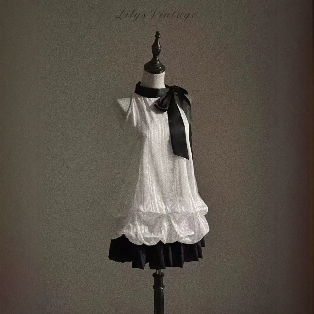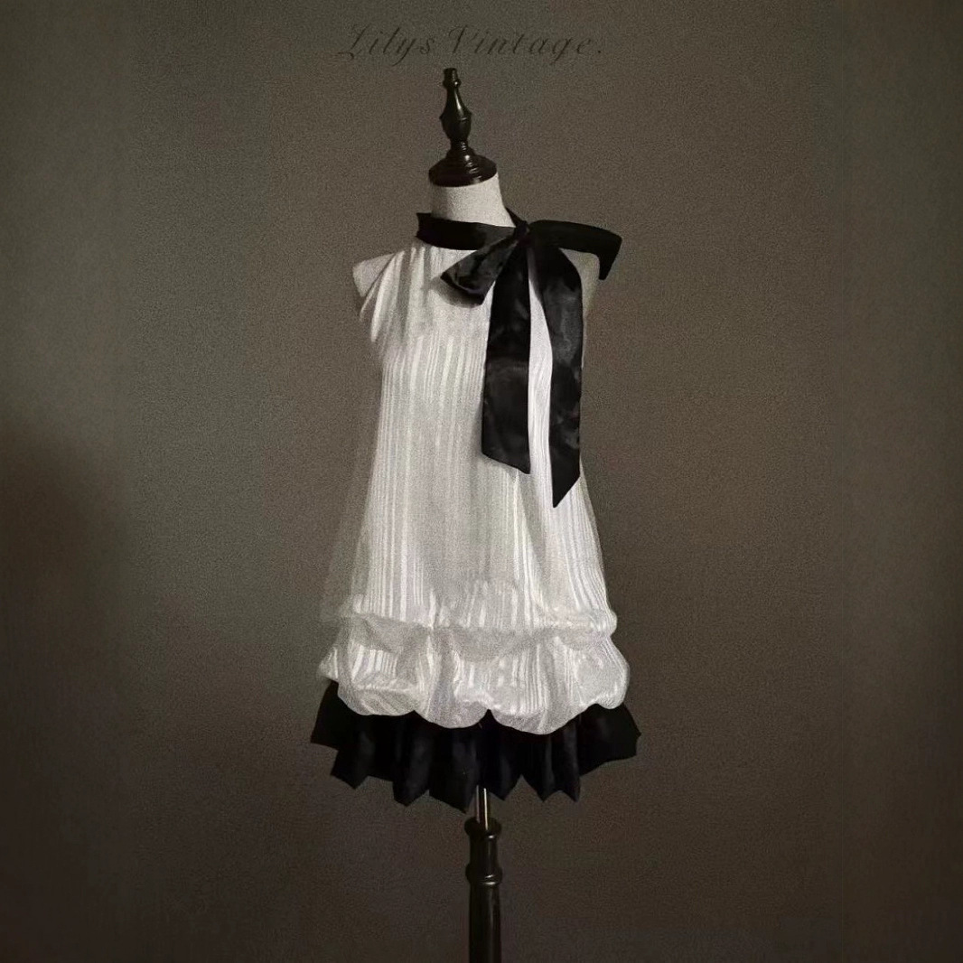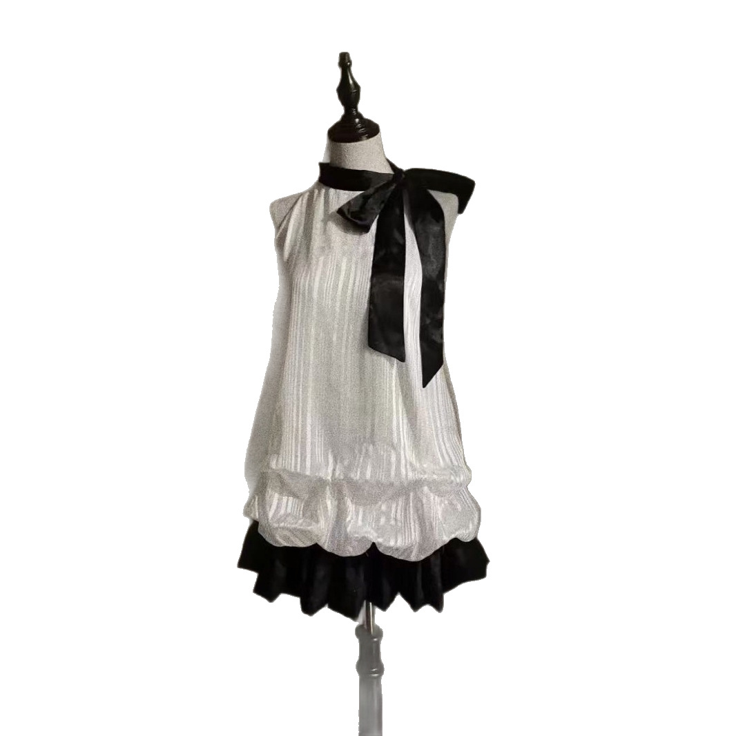 Color: Black and white halter neck fake two-piece dress