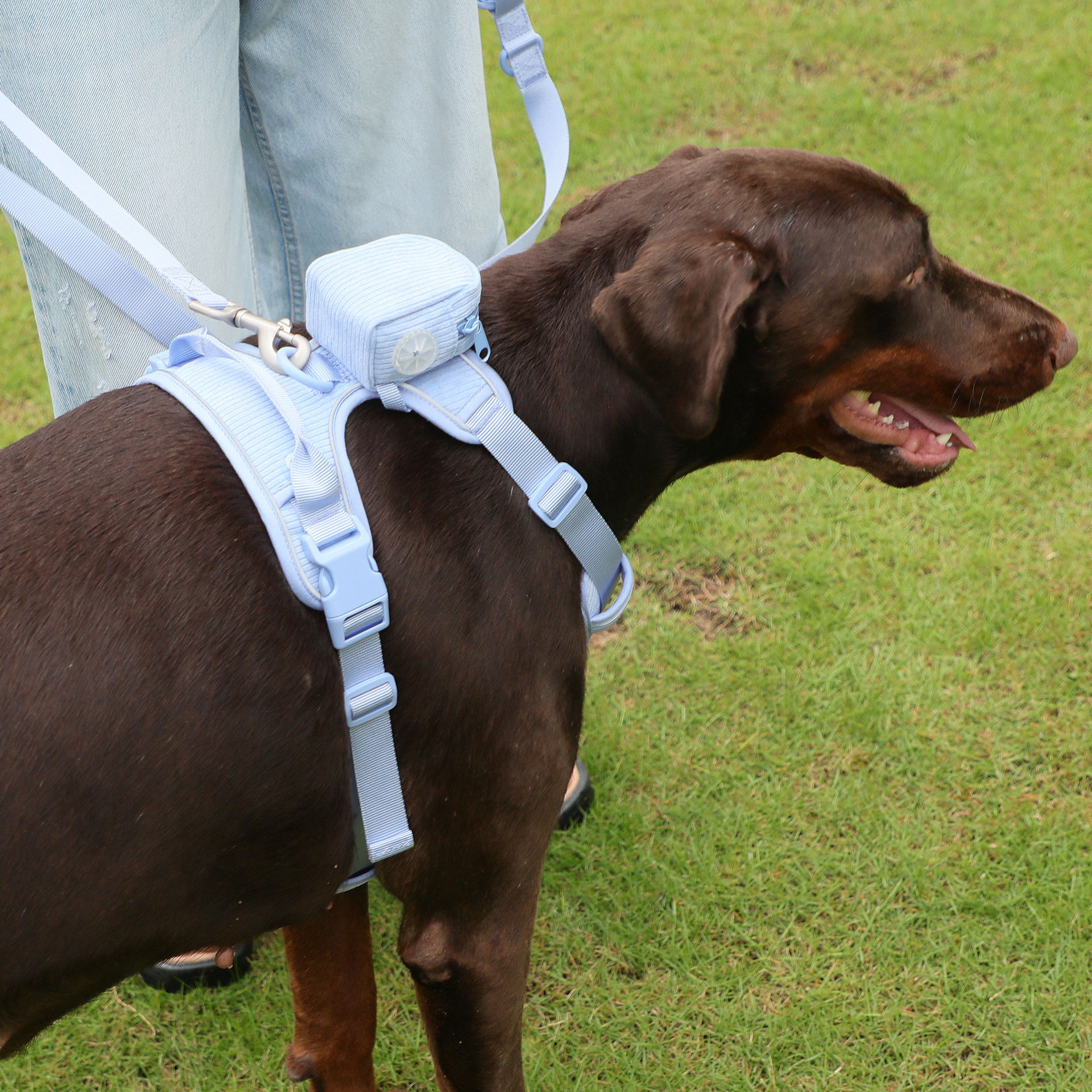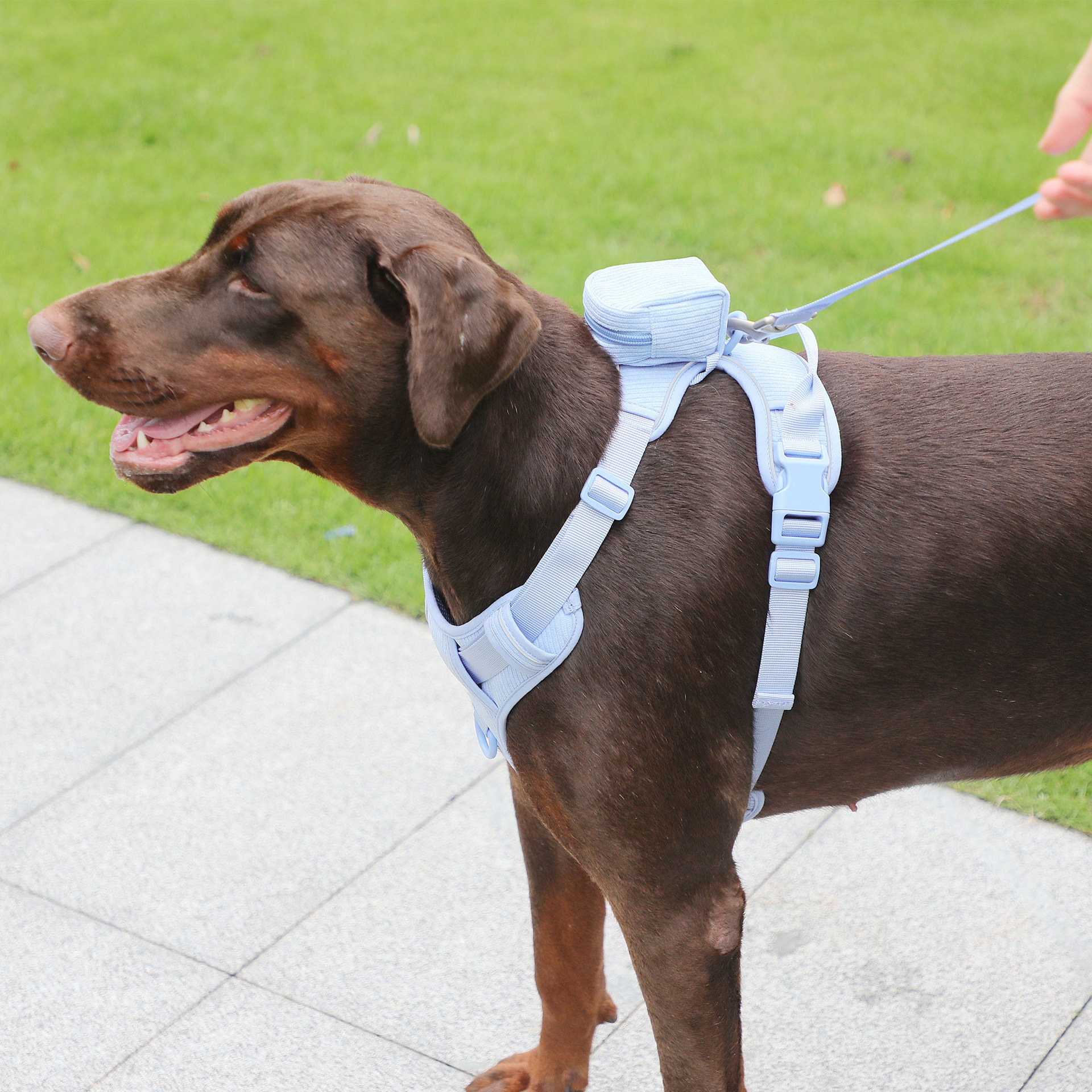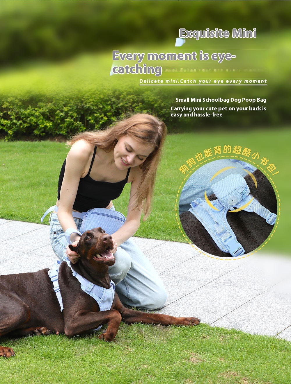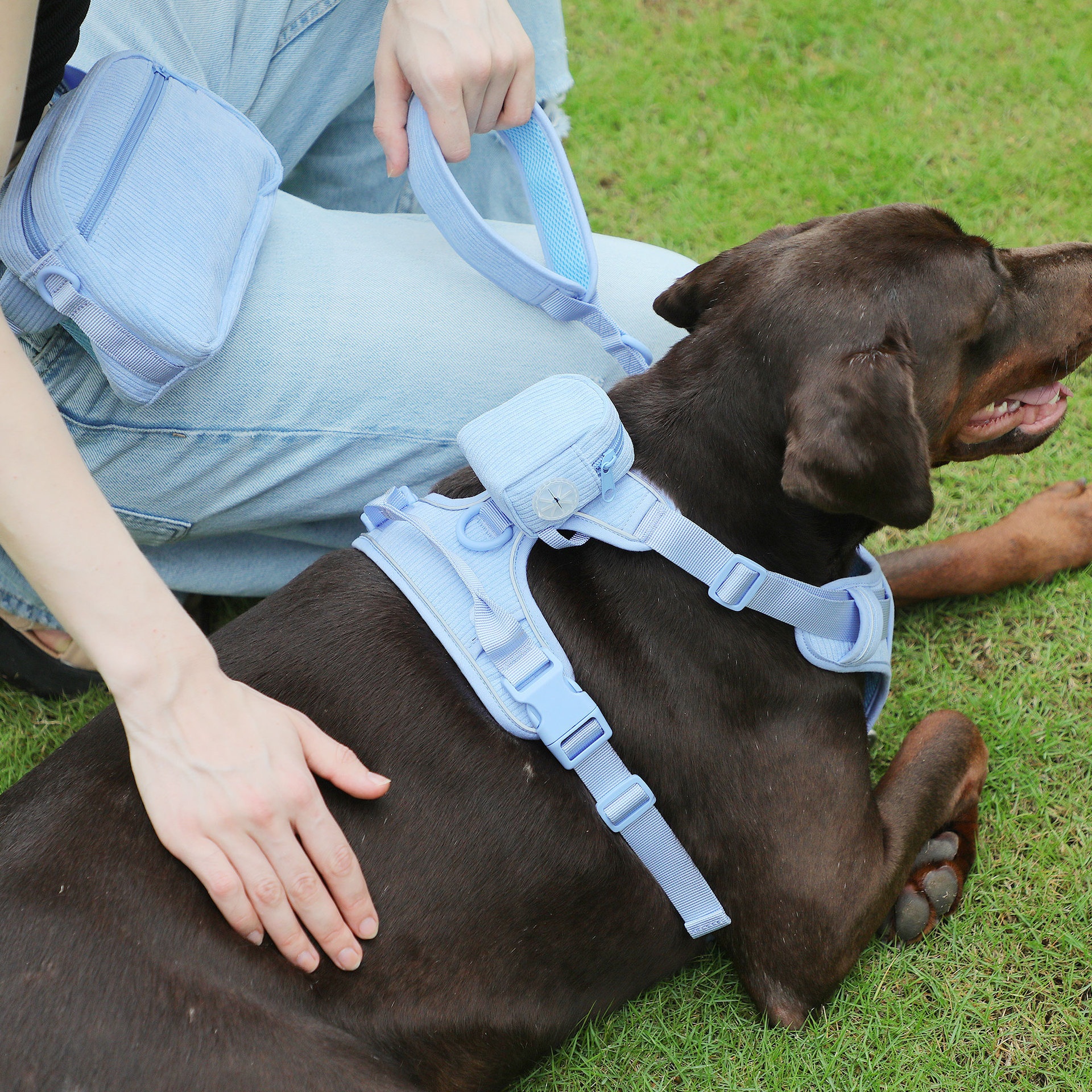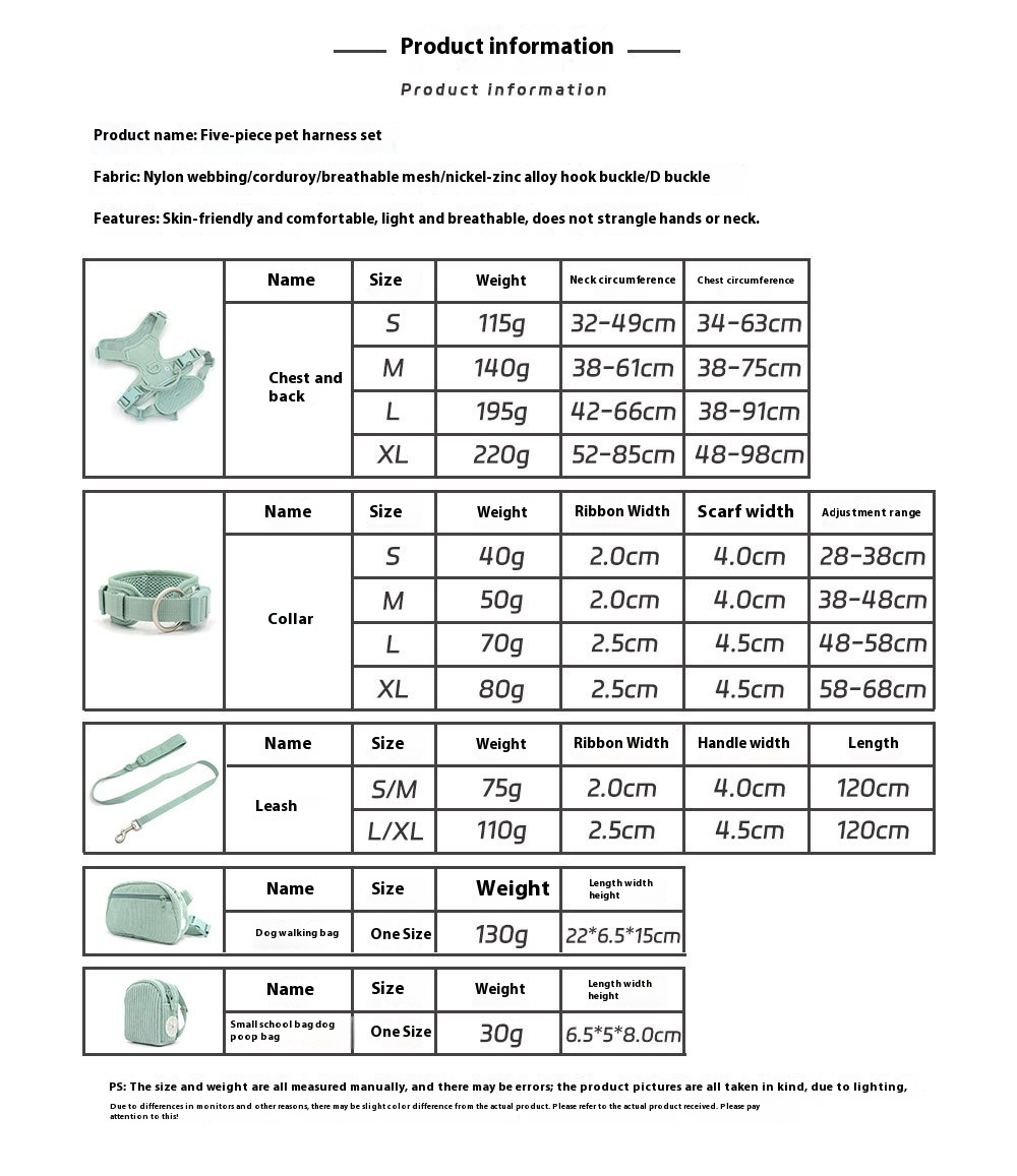 Color: baby blue pet collar, baby blue pet hand holding rope, baby blue pet's chest-back, baby blue mini schoolbag dog stool bag, baby blue dog walking bag