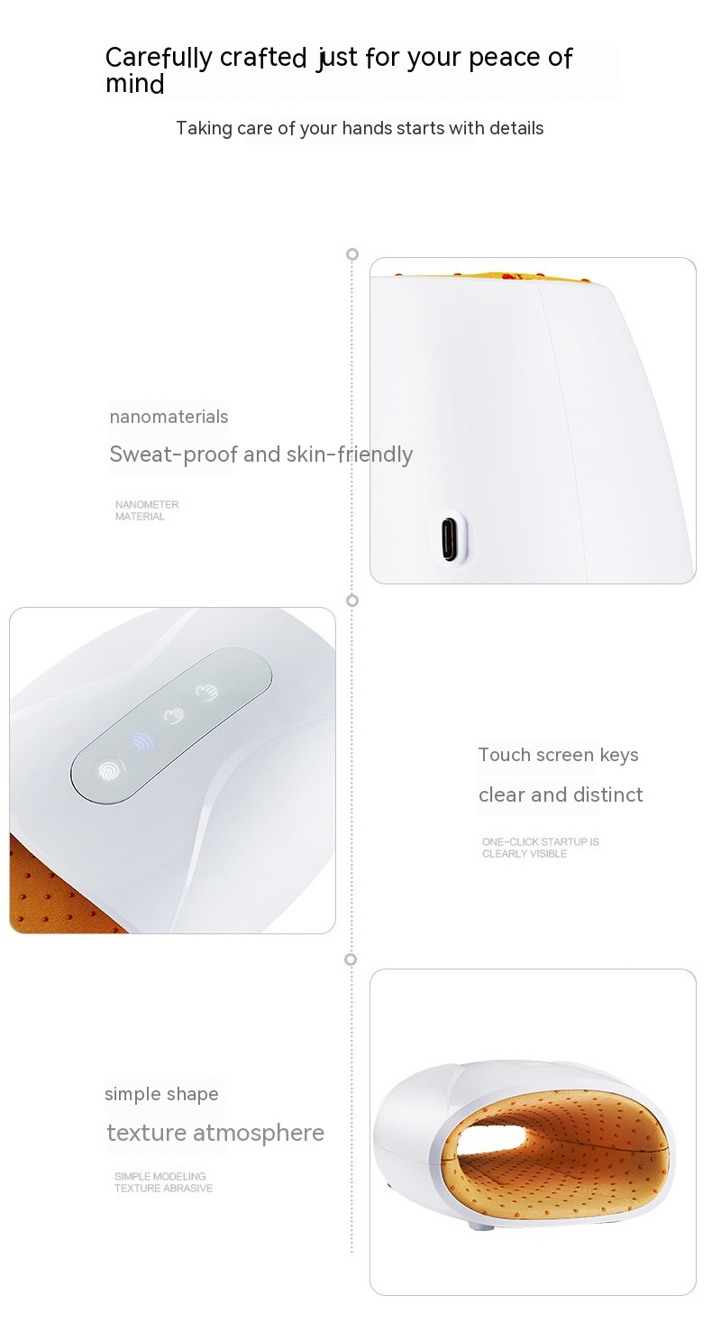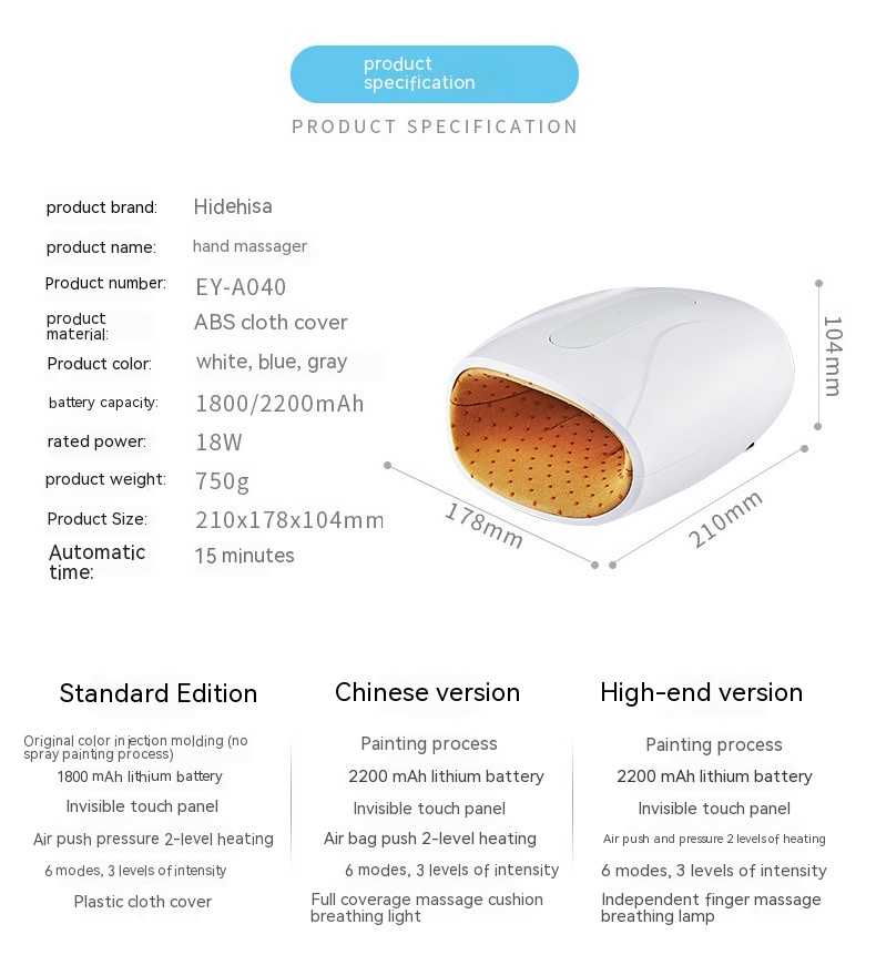 Painting process, 2200mAh lithium battery, intensity control, hot compress control, male and female modes, independent five-finger covering massage, panel breathing light, airbag massage, invisible touch, smart timing, nanomaterials, sweat-proof and skin-friendly