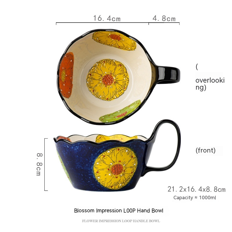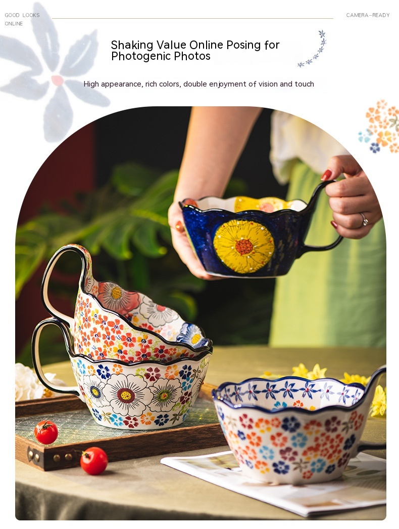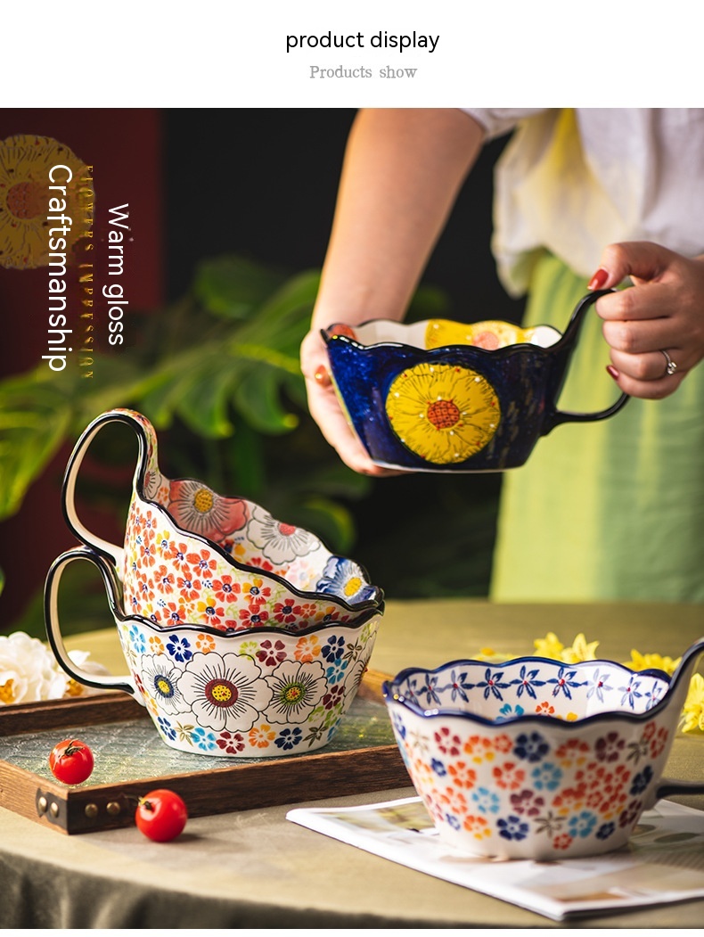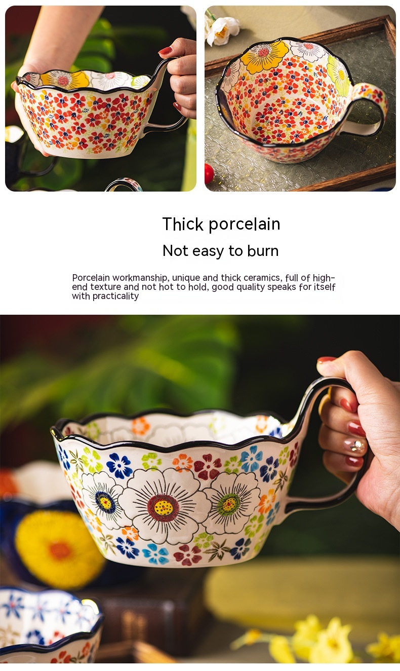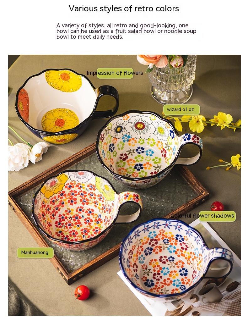 Color: Full Flower purplish red cycle handle bowl, Wizard of Oz cycle handle bowl, flower impression cycle handle bowl, colorful flower shadow cycle handle Bowl