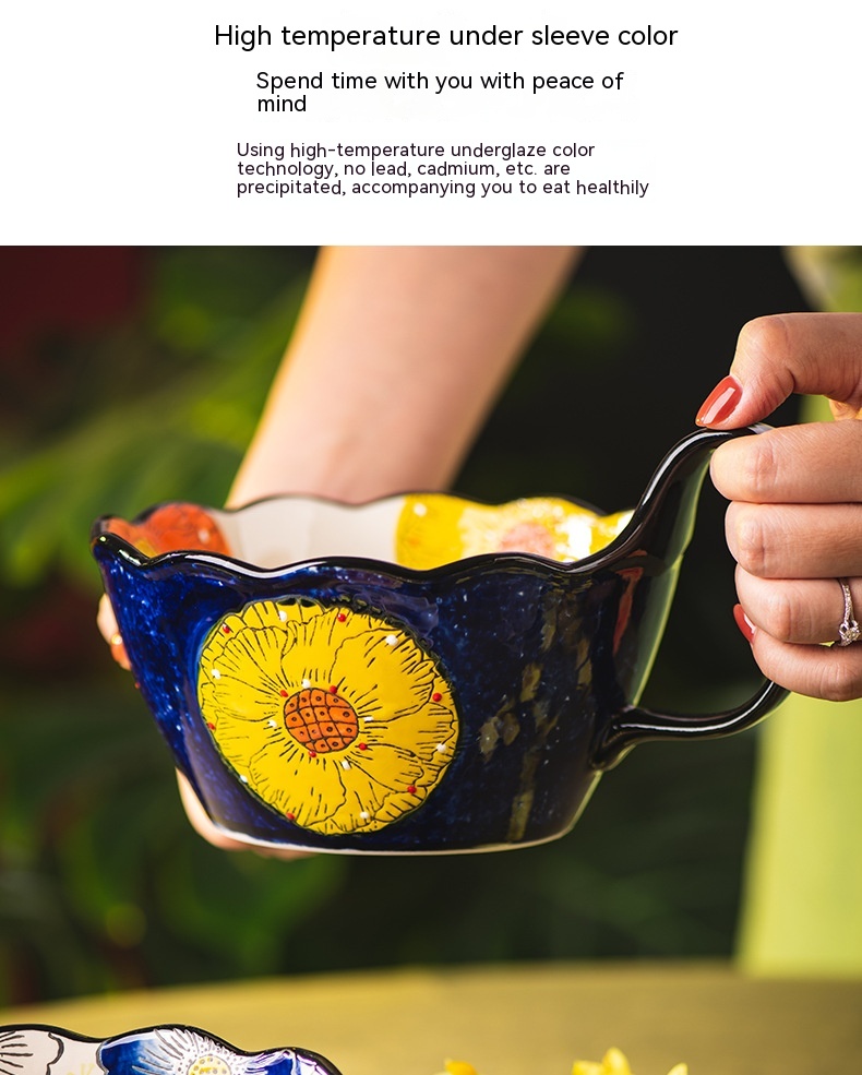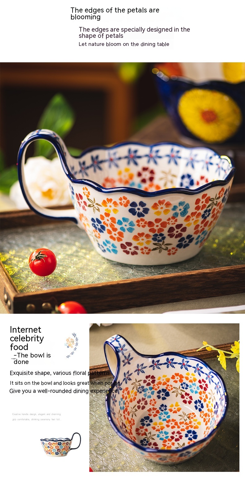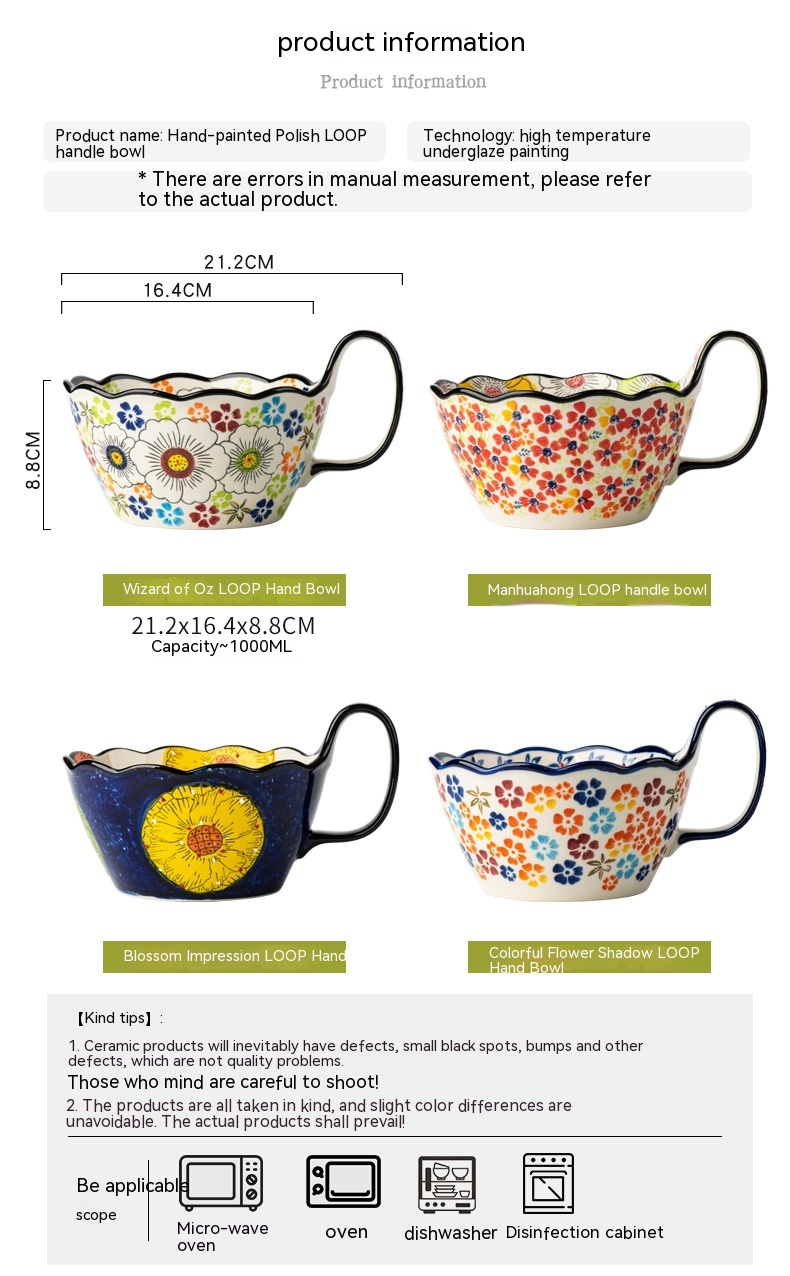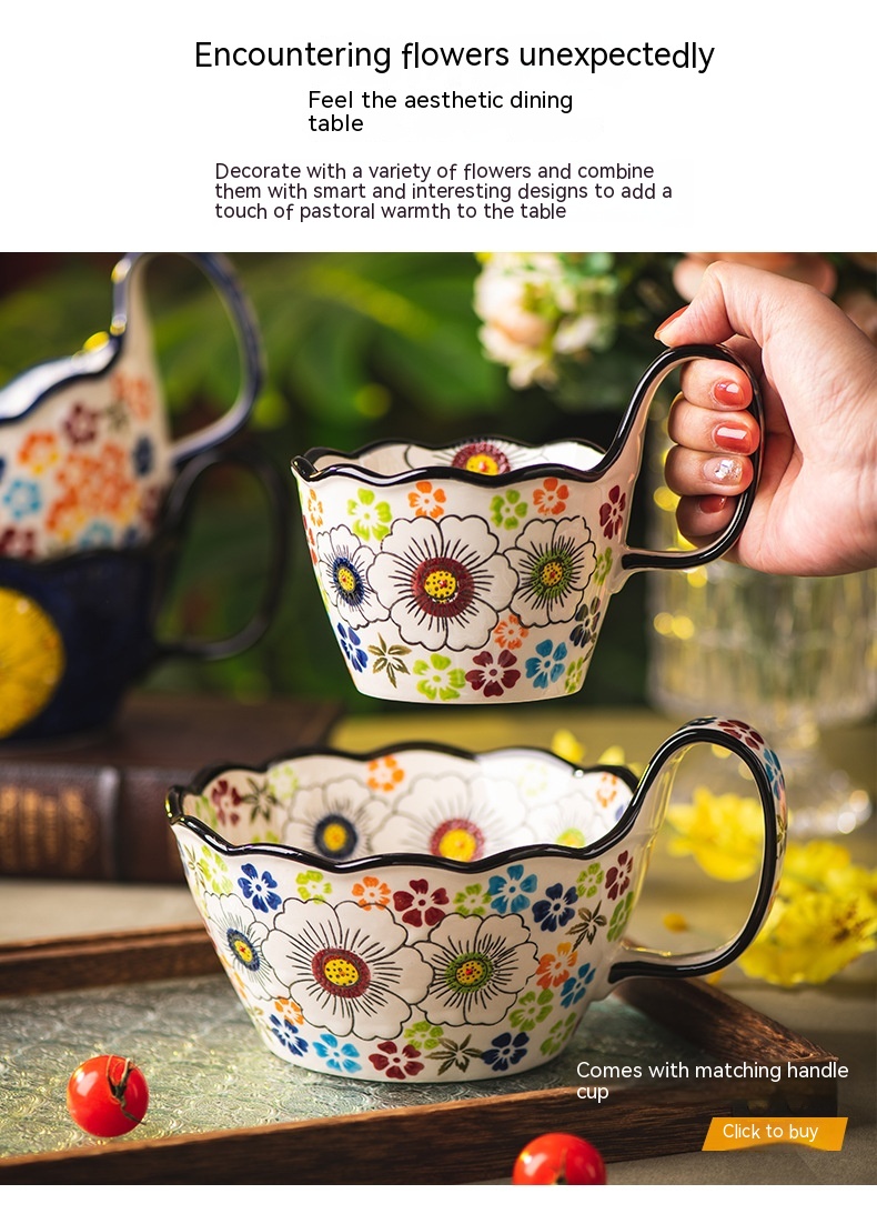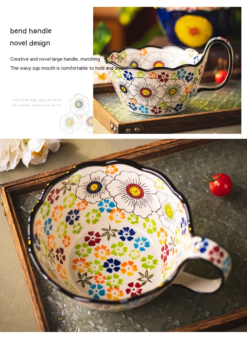 Color: Full Flower purplish red cycle handle bowl, Wizard of Oz cycle handle bowl, flower impression cycle handle bowl, colorful flower shadow cycle handle Bowl