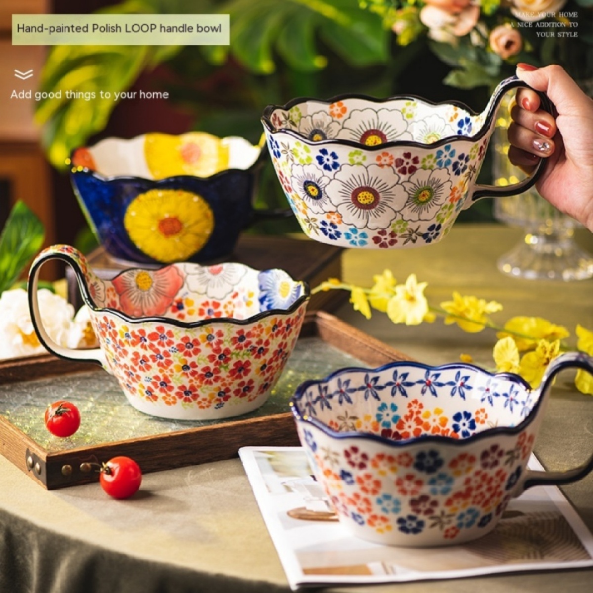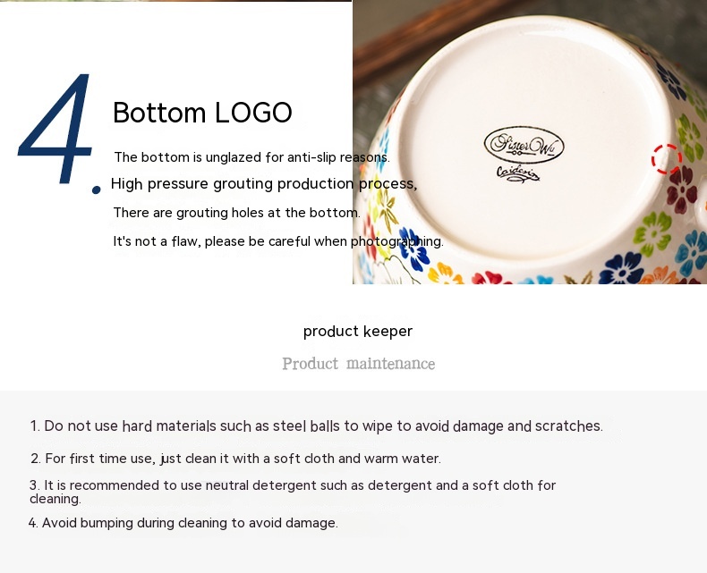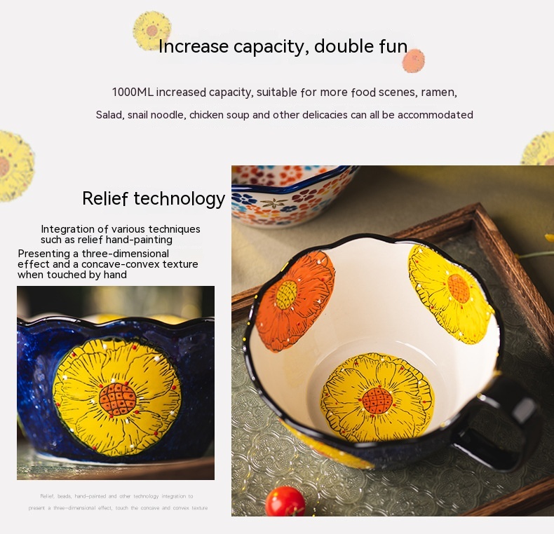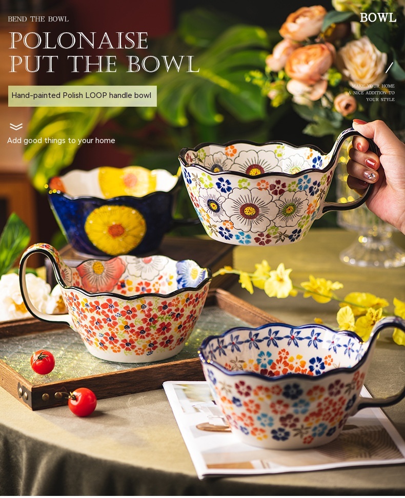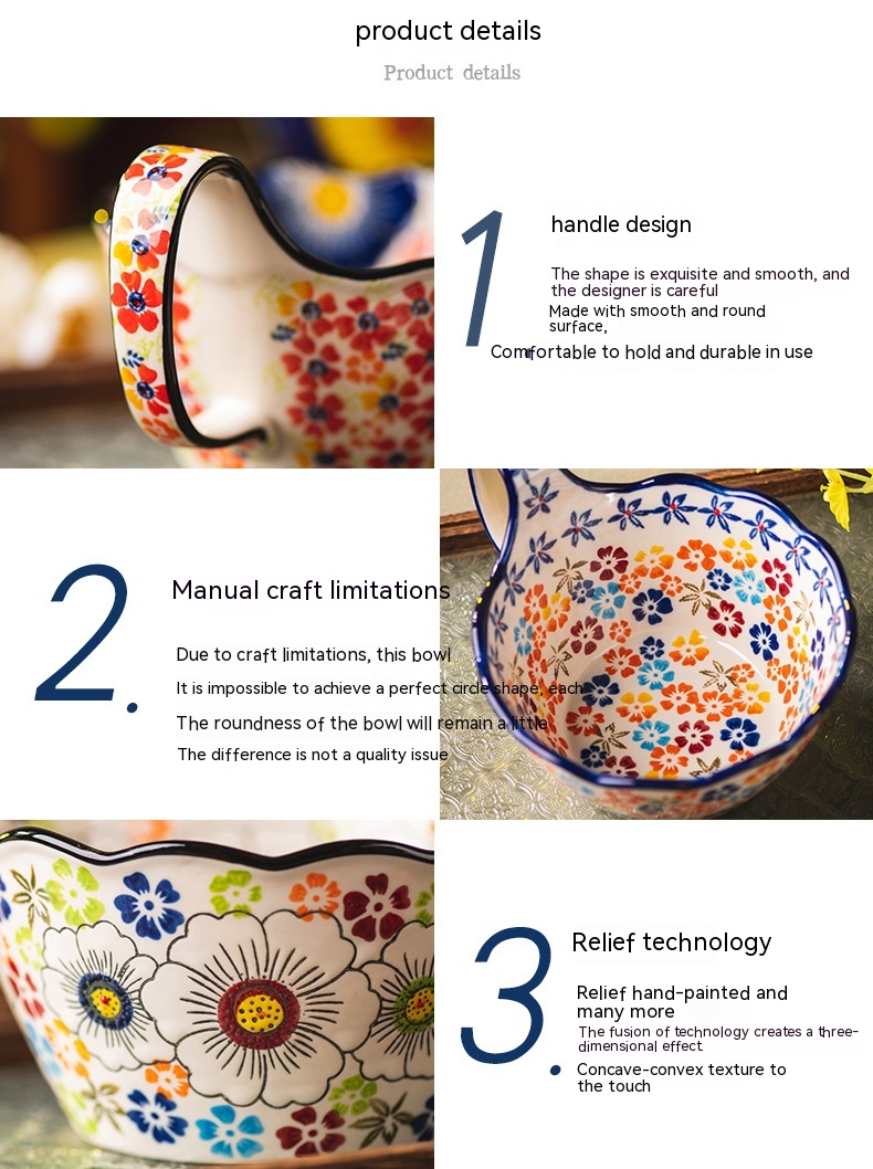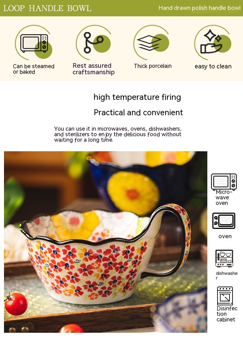 Color: Full Flower purplish red cycle handle bowl, Wizard of Oz cycle handle bowl, flower impression cycle handle bowl, colorful flower shadow cycle handle Bowl