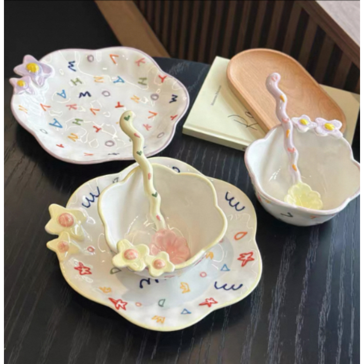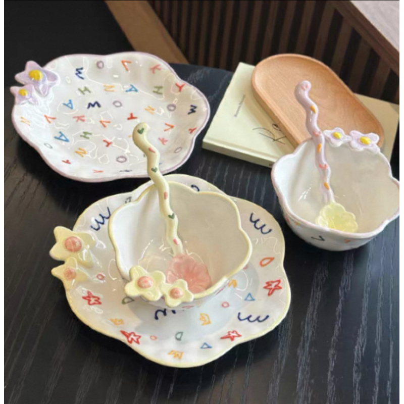 Styles: Purple bowl and spoon set, Beige bowl and spoon set, Purple lettered plate, Beige polka-dot plate, Purple grape plate, Beige peach plate