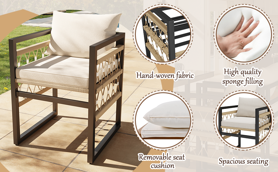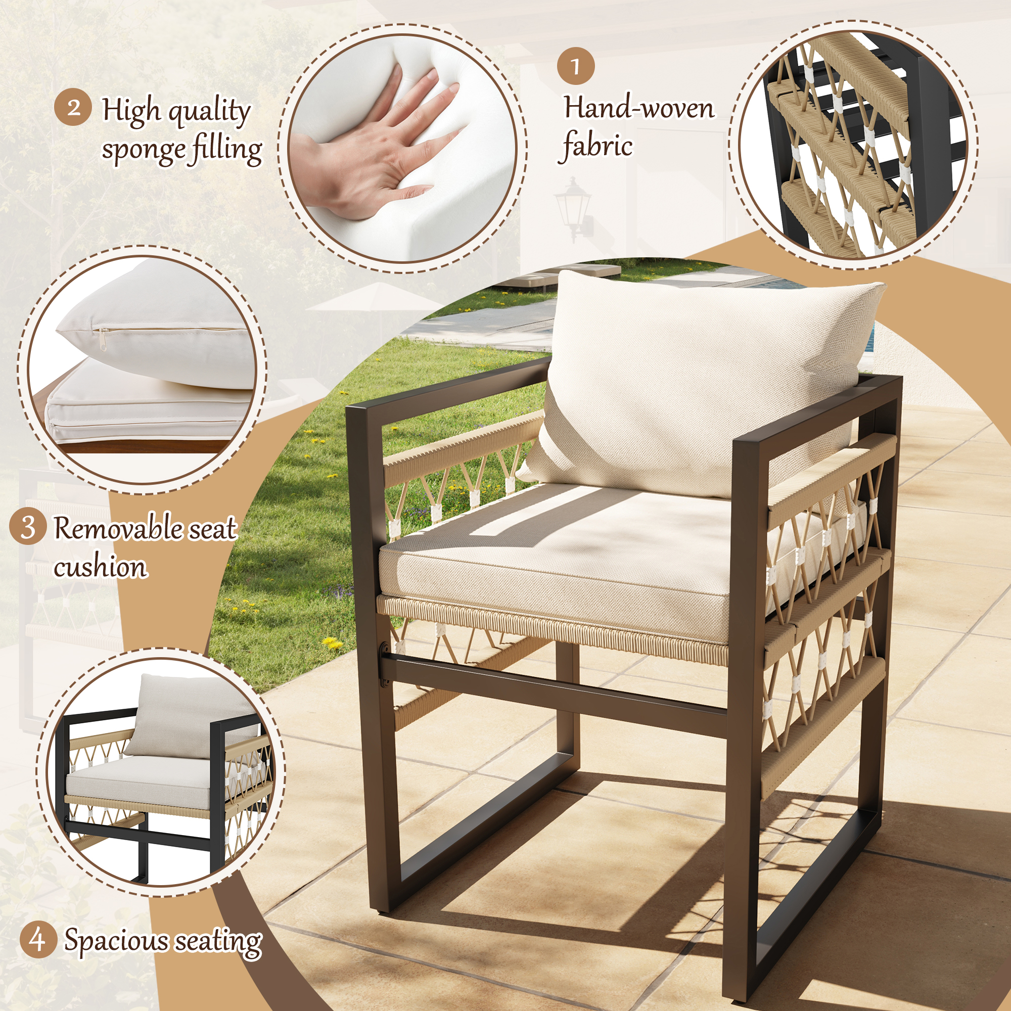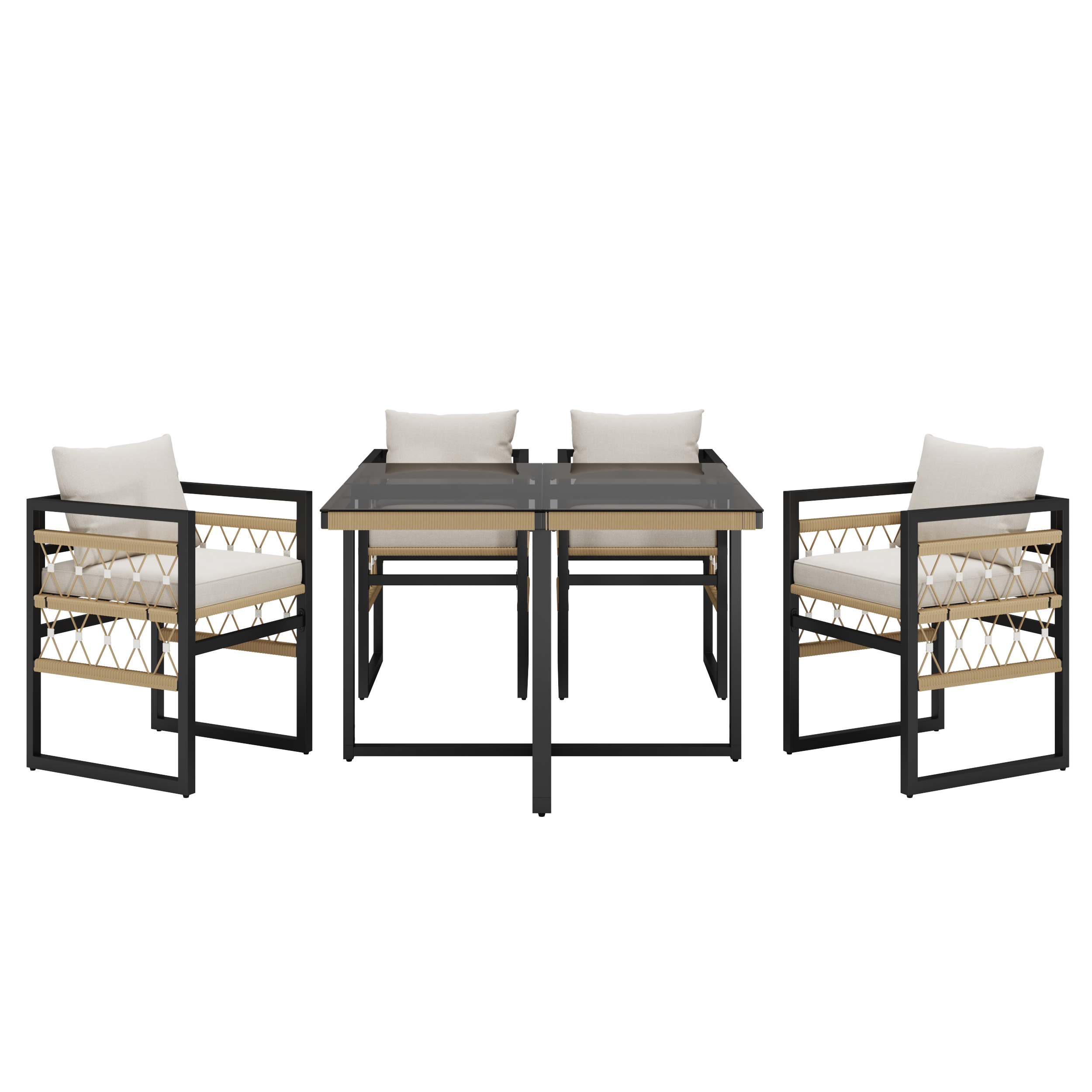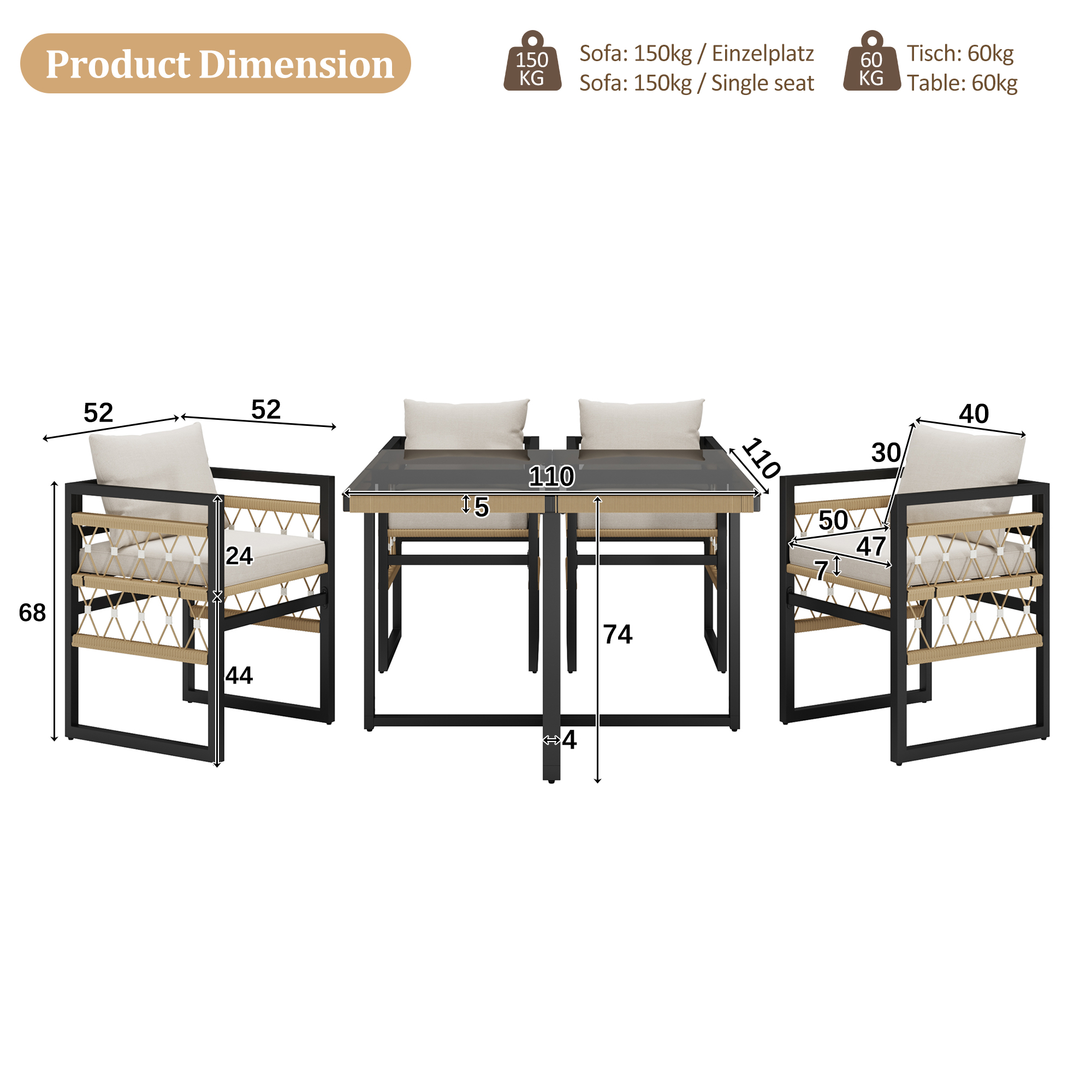 Product Name:Hand-Woven Garden Sofa Set for 4 People / Made of Sturdy Iron with 4 Beige Cushions / Incl. 1 Safety Glass Table & 4 Armchairs / Weather-Resistant Patio Furniture