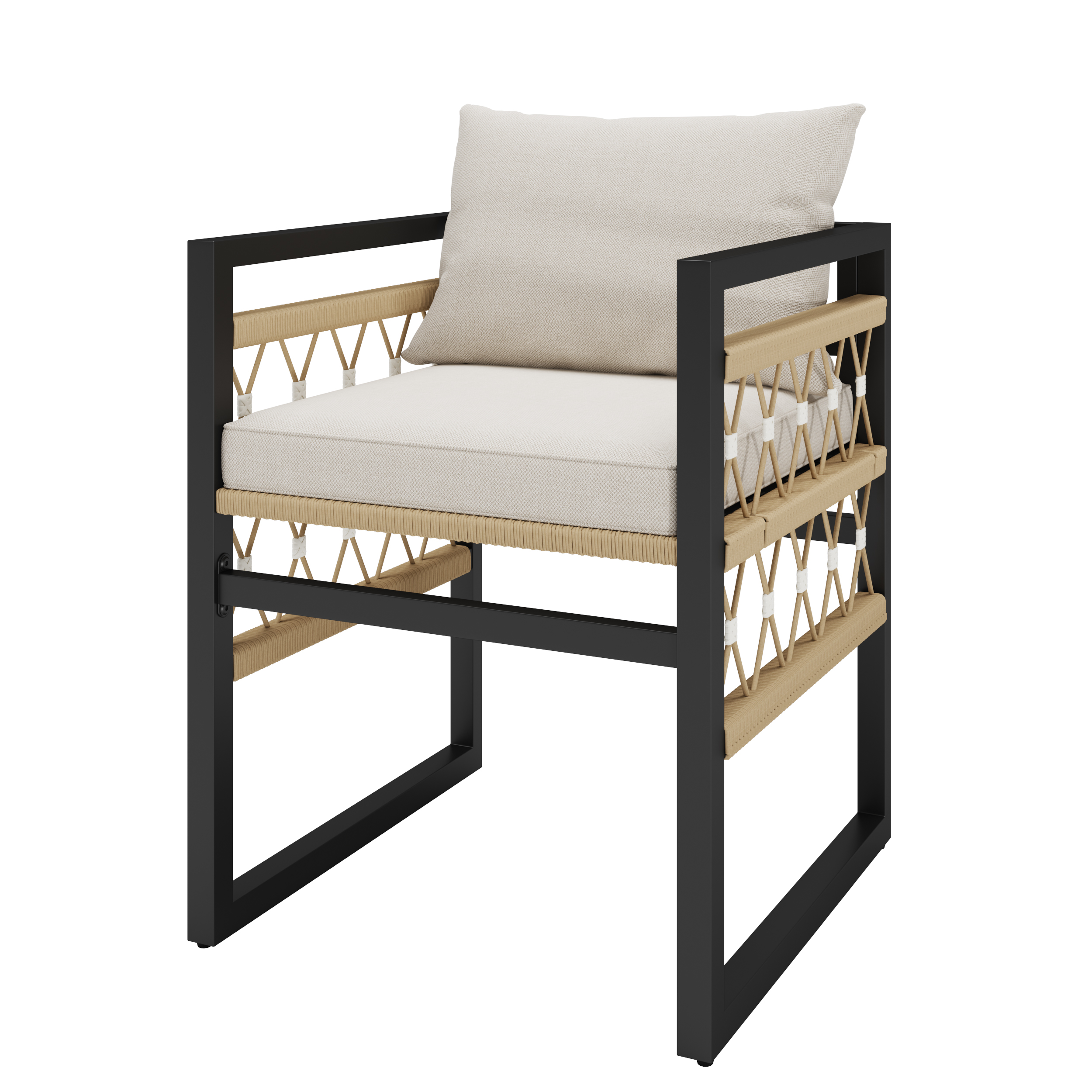 This set offers seating for 4 people and includes 4 armchairs and a glass table. 8 cm thick, breathable cushions provide comfort. The hand-woven armrests lend a unique design. The elegant, versatile color scheme suits many styles. Comfortable and durable – ideal for relaxation or business talks outdoors!